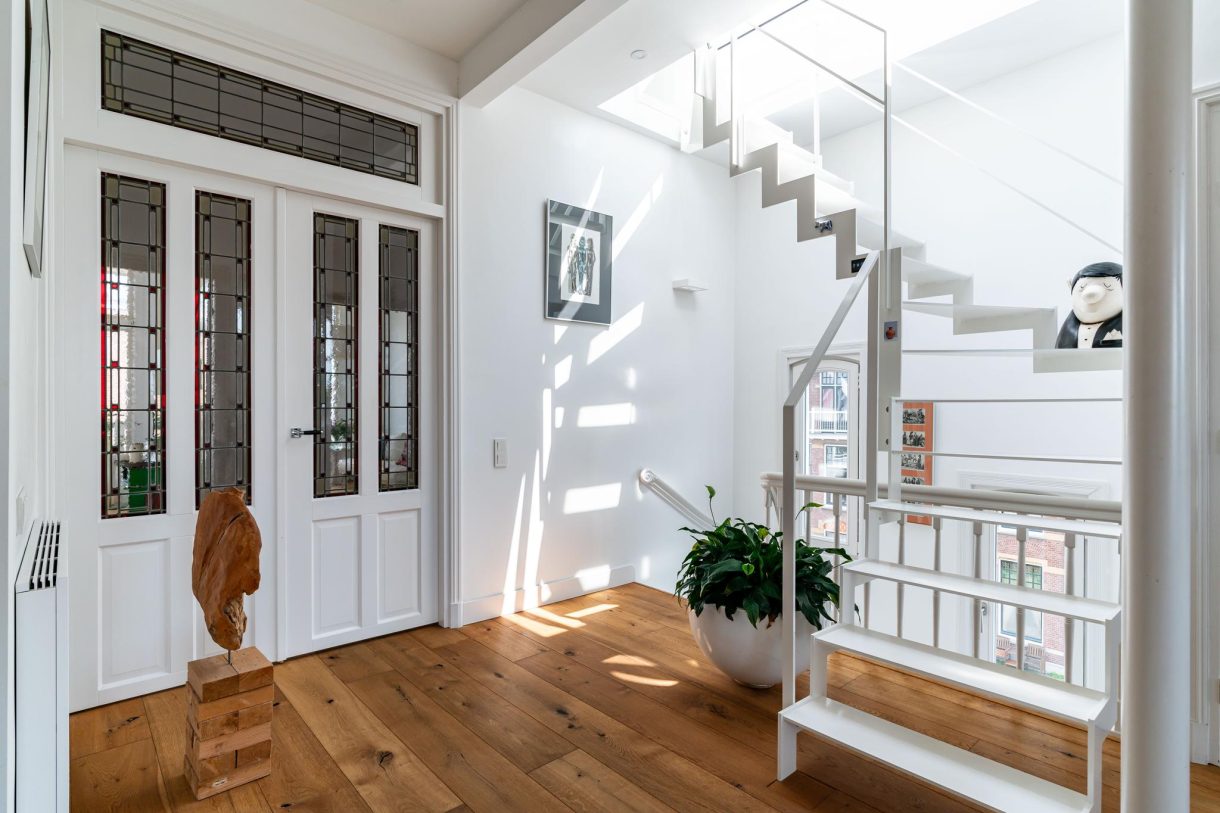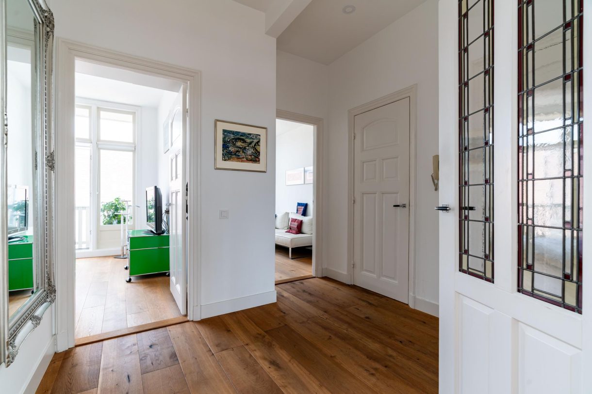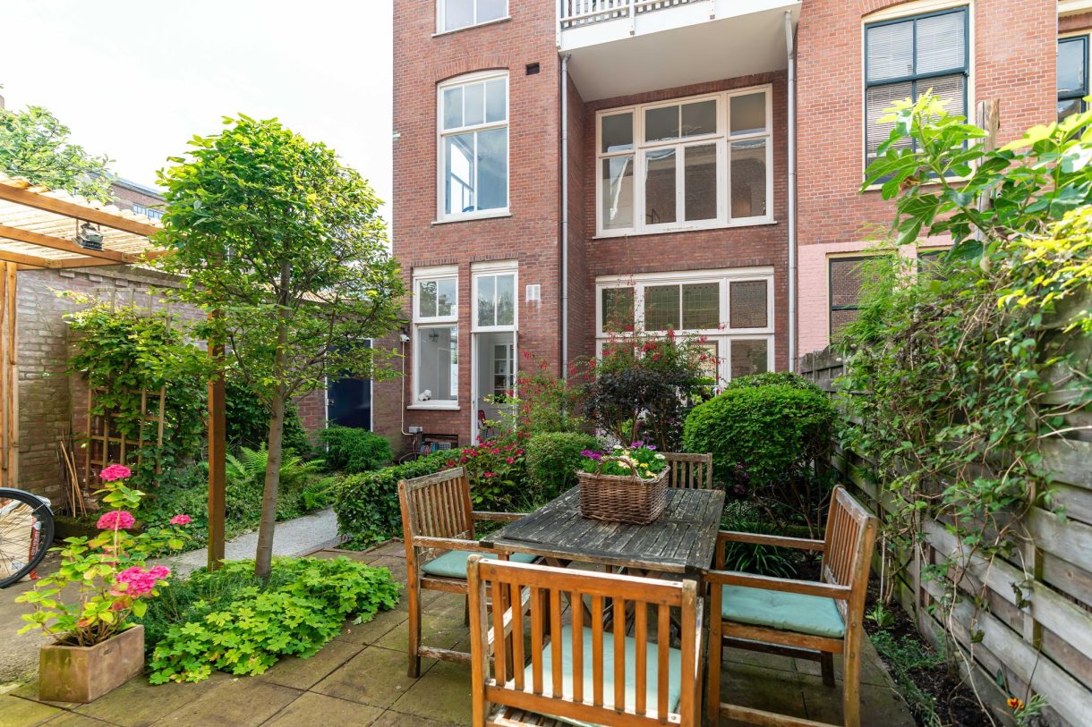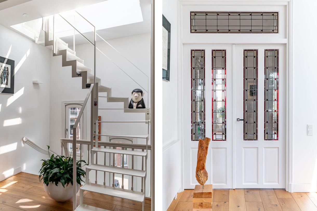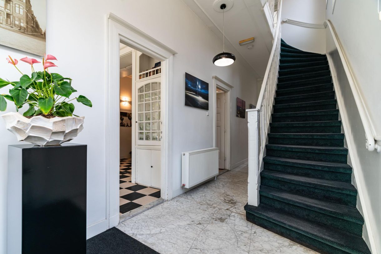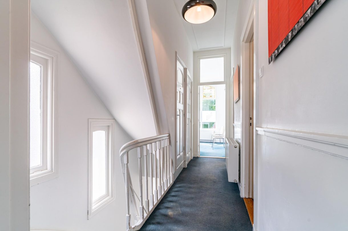 Vanuit de ontvangstruimte een brede trap naar de eerste etage, overloop met apart toilet en pantry, zijkamer aan de voorzijde met ramen aan tweede zijden dankzij ligging op de hoek. Hetzelfde geldt voor de zijkamer aan de achterzijde die tevens goed van formaat is. Vrij uniek voor Statenkwartier herenhuizen is dat de suiteseparatie op de eerste etage intact is gebleven en nog is voorzien van schuifdeuren en vaste kasten. Op deze etage wordt de vrije ligging van het pand benadrukt dat in combinatie met de grote raampartijen en de hoge ornamenten plafonds resulteert in een zeer aangename sfeer.