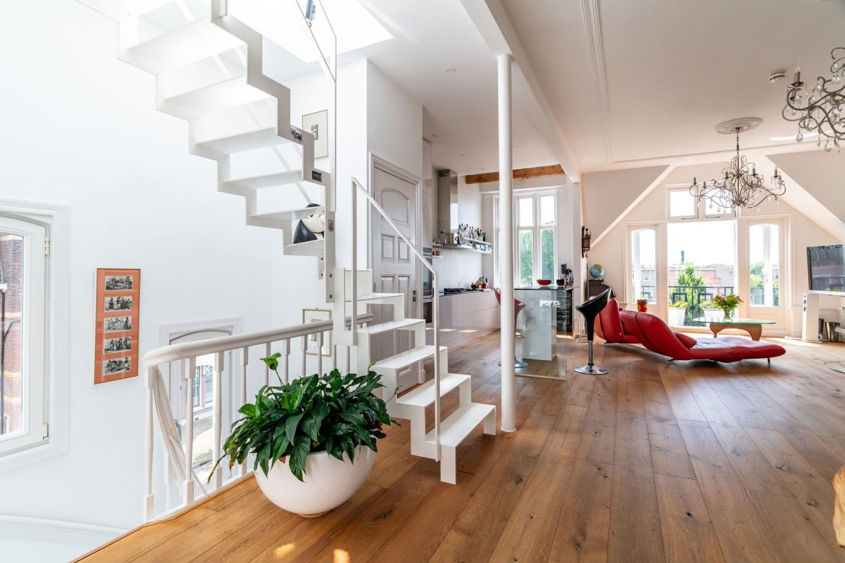 Middels een afgesloten deur is de woonetage op de tweede verdieping te bereiken met een klassiek trappenhuis en een doorgebroken woonkamer aan de zuidwestkant van dit indrukwekkende herenhuis. De woonkamer is tot aan de nok van de toren doorgebroken waarbij de originele balken een mooi contrast vormen met het strakke stucwerk. De luxe open keuken is voorzien van composiet werkblad, hoog model Siemens bakoven, inbouw stoomoven, vaatwasser, Quooker en wijnklimaatkast. Daarnaast beschikt deze woonkamer over een open haard, fraaie houten vloeren en een charmant voorbalkon met vrij uitzicht over het Statenkwartier. Tussengelegen overloop en woonkamer beschikken over vloerverwarming per CV-ketel.