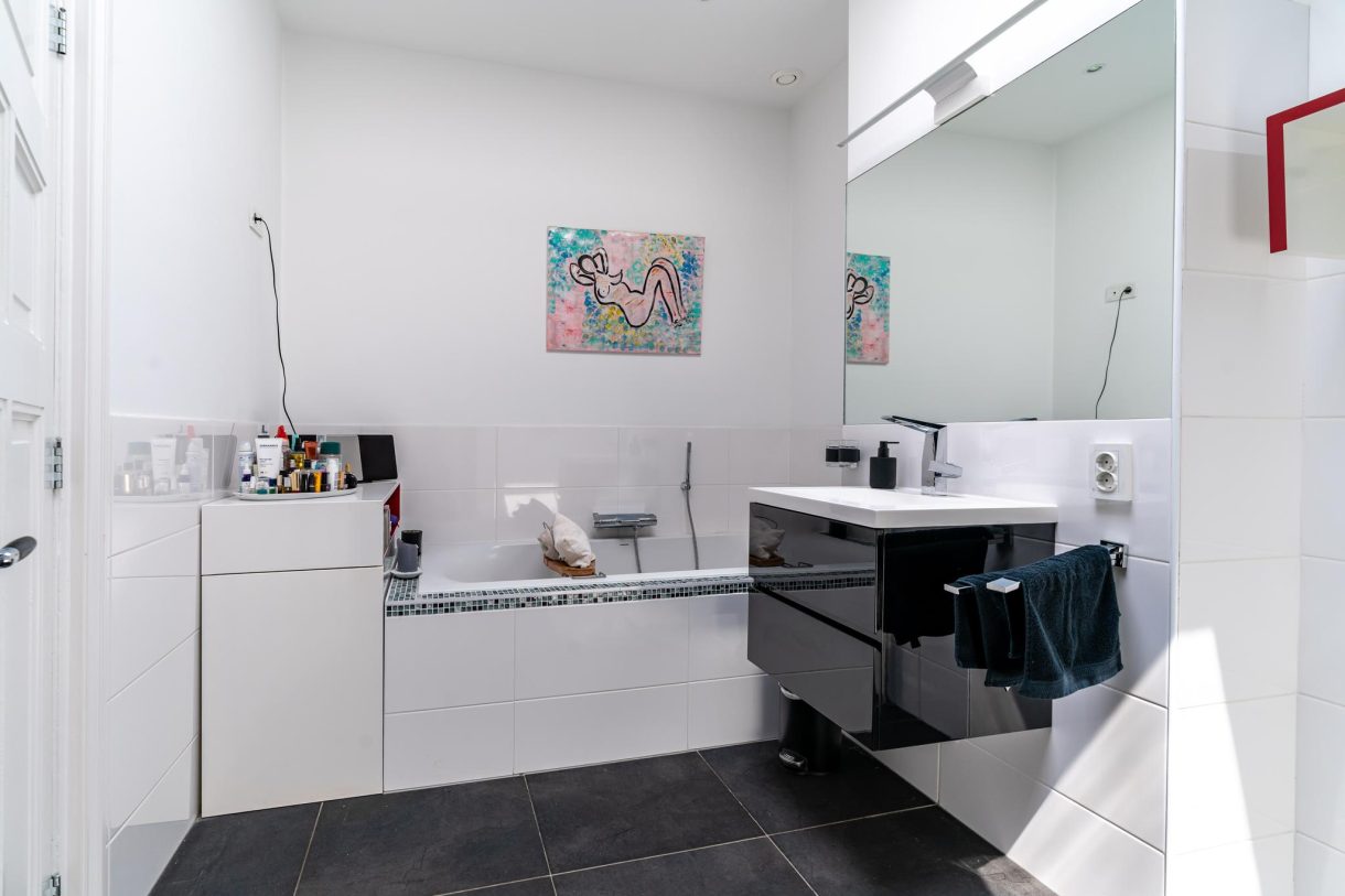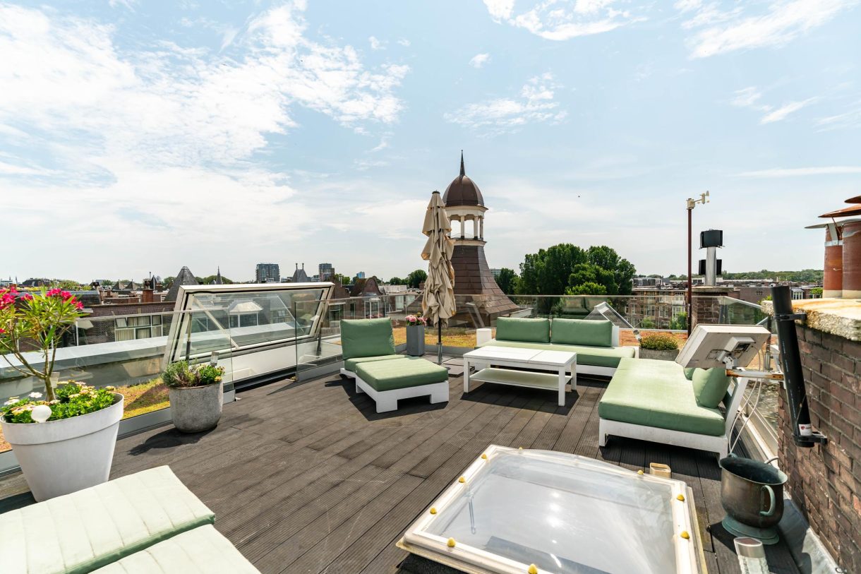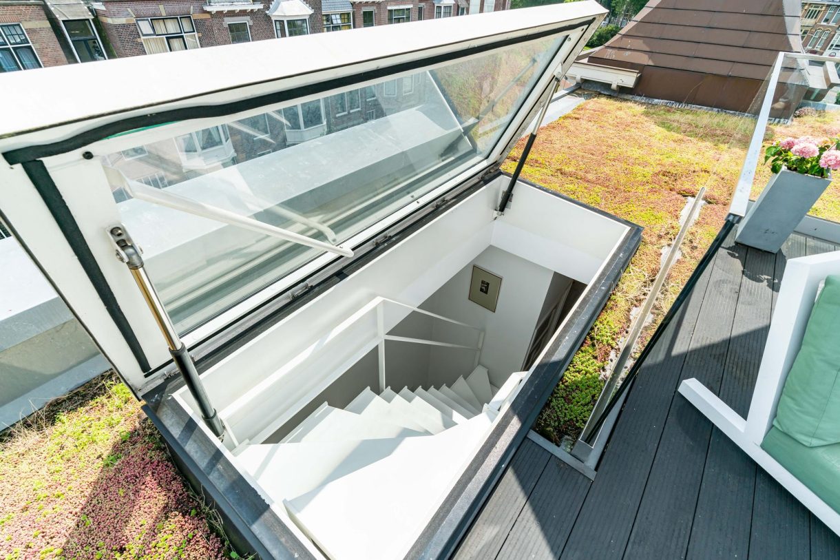 De echte eyecatcher is de zwevende trap naar het dakterras dat is voorzien van hoogwaardig dakluik, een stijlvolle glazen balustrade, composiet vlonders en wordt omringd door een groen sedum dak. Op de woonetage zijn nog twee ruime slaapkamers te vinden die rustig zijn gelegen aan de achterzijde van het gebouw waarbij de hoofdslaapkamer beschikt over een maatwerk kastenwand en openslaande deuren naar achterbalkon. De tussengelegen badkamer beschikt over fraai tegelwerk, ligbad, inbouwkast, meubel met wastafel, handdoekradiator en inloopdouche met glazen wand.