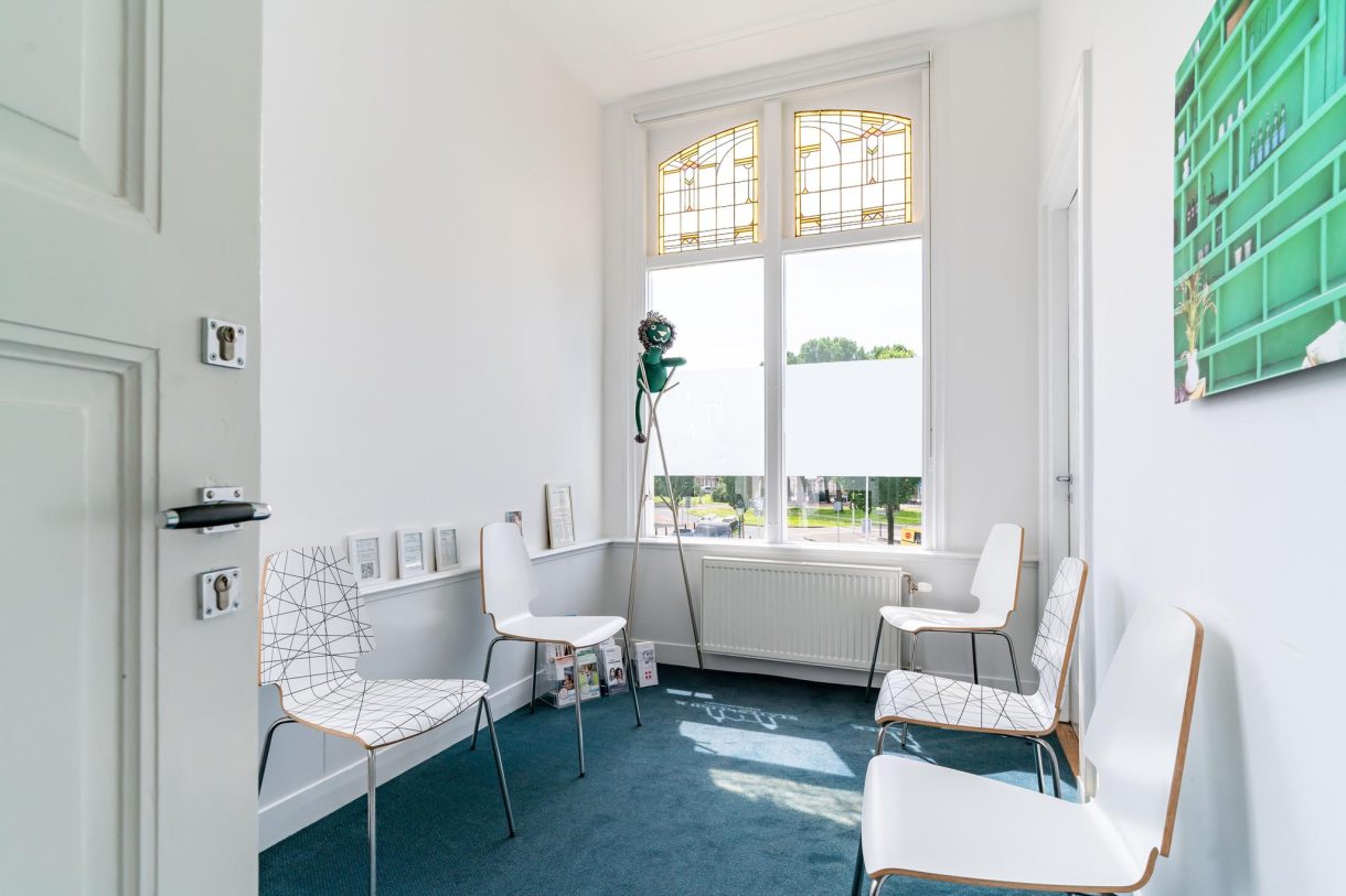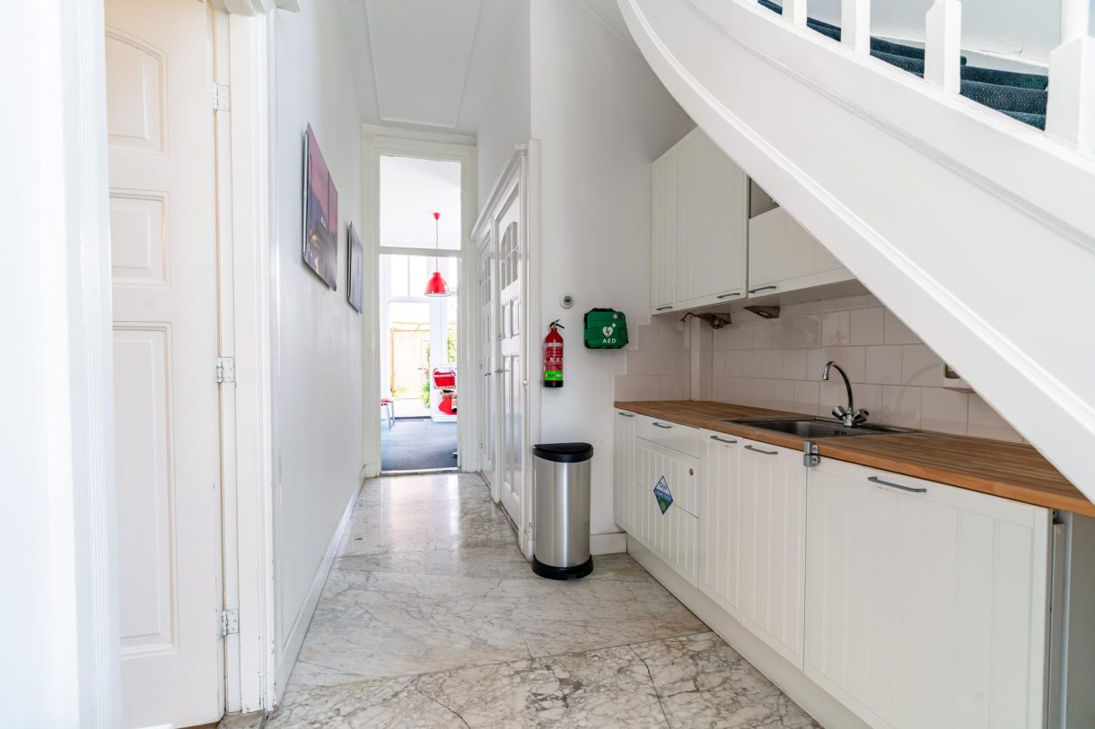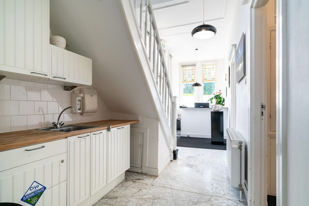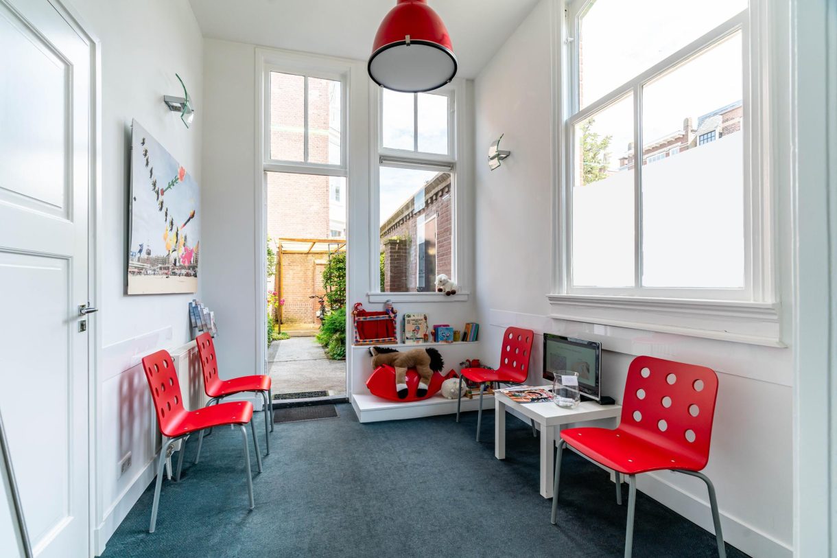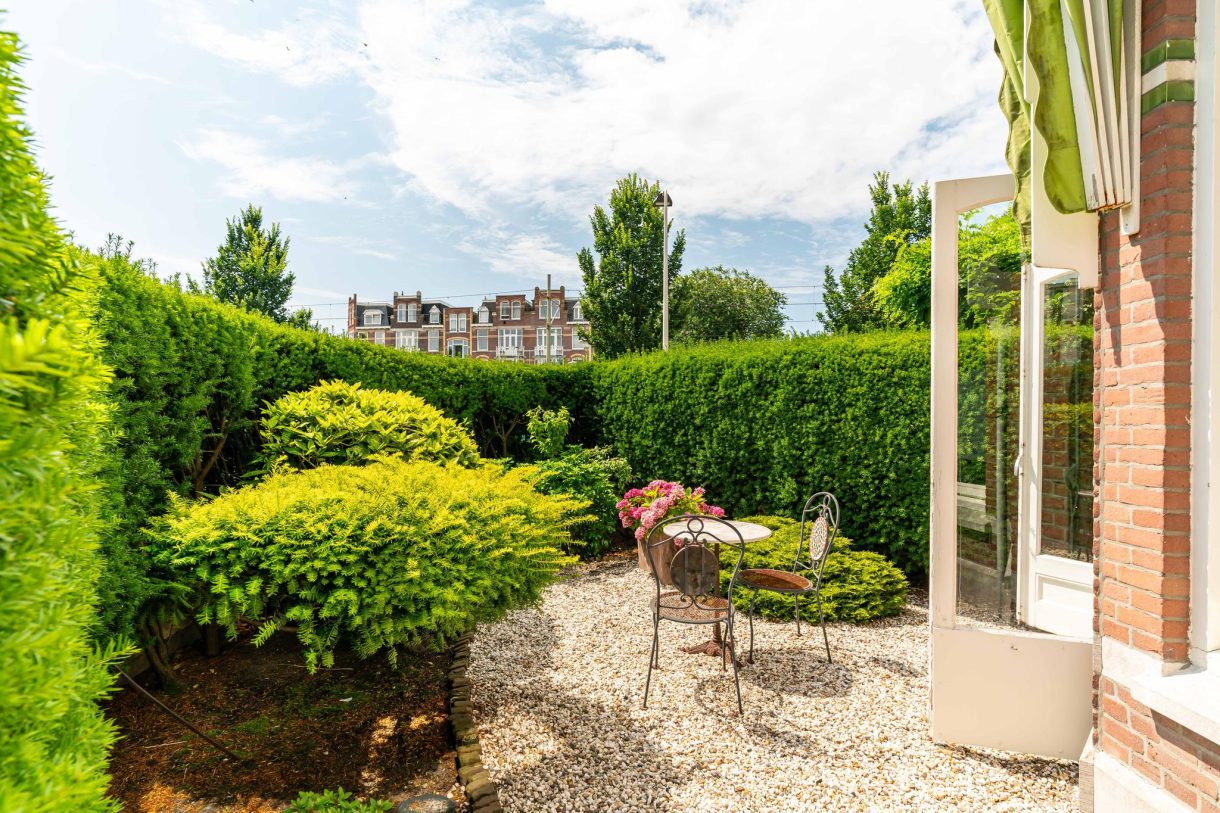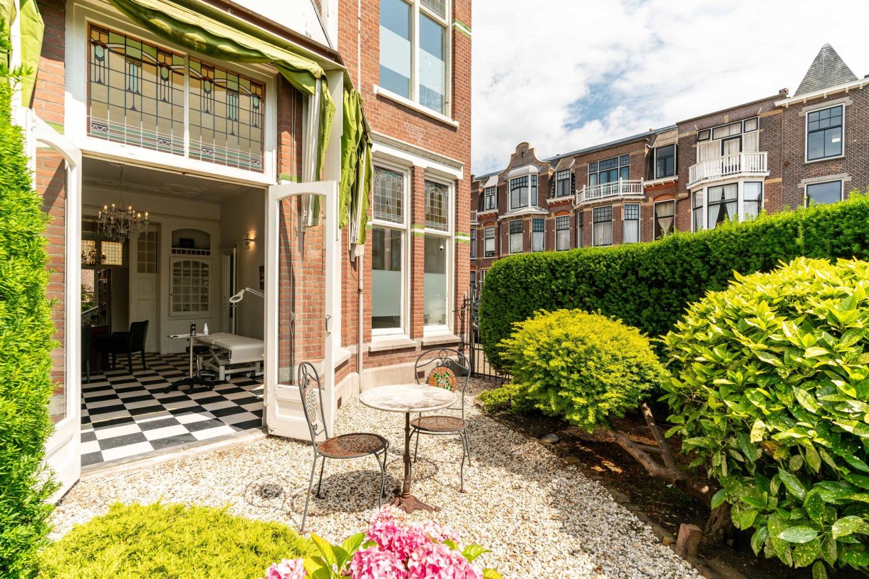 Riante voortuin waardoor het pand ver van de weg is gelegen, entree vanuit de Frankenslag met enorme hal die wordt gebruikt als ontvangstruimte en beschikt over een schitterende lichtinval, fraaie glas in lood bovenlichten, grote marmeren vloertegels, pantry, apart toilet met klapraam, wachtkamer en deur naar keurig aangelegde achtertuin van ca. 71 m² die beschikt over een zijingang en gunstig is gelegen op de ochtendzon.