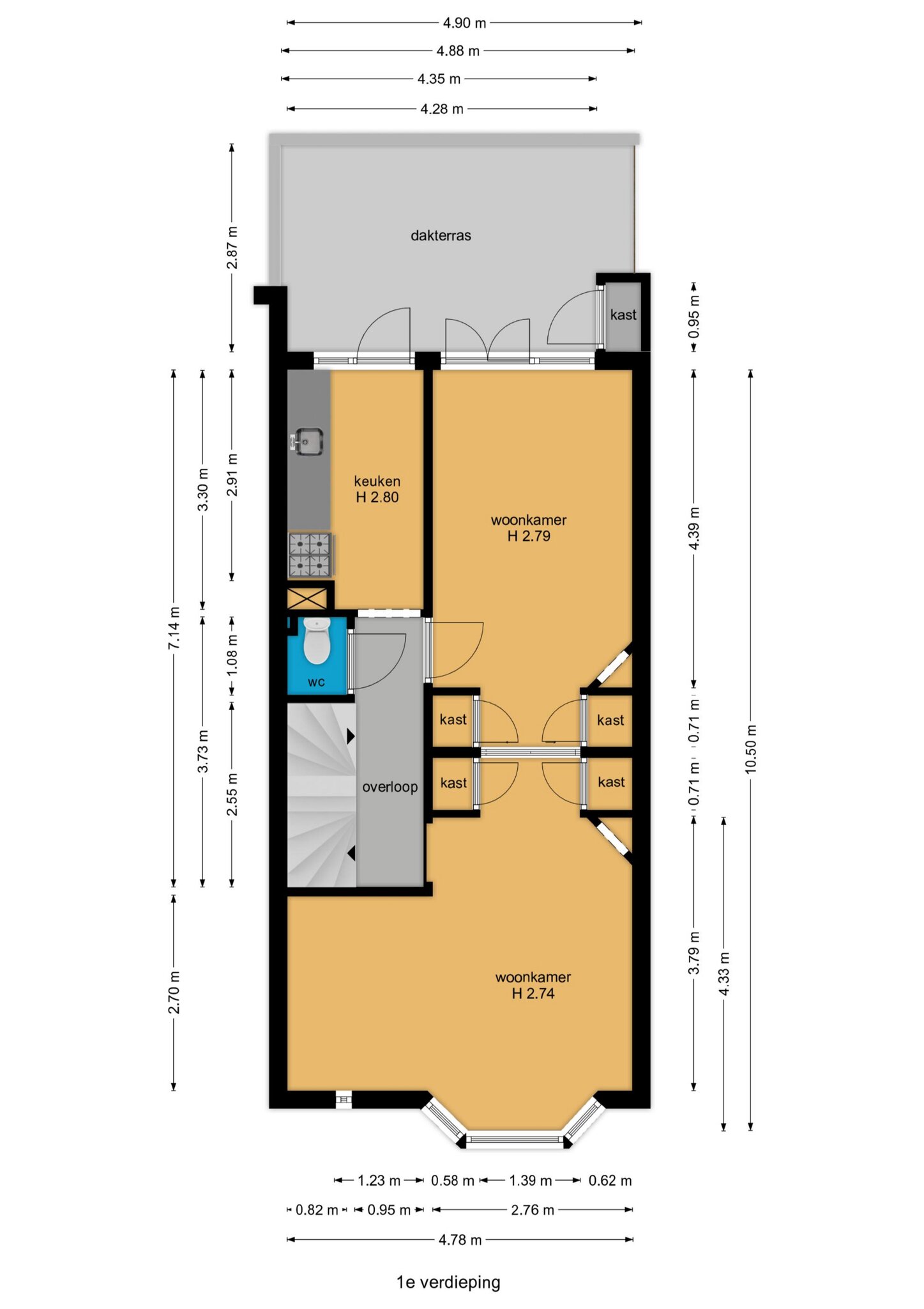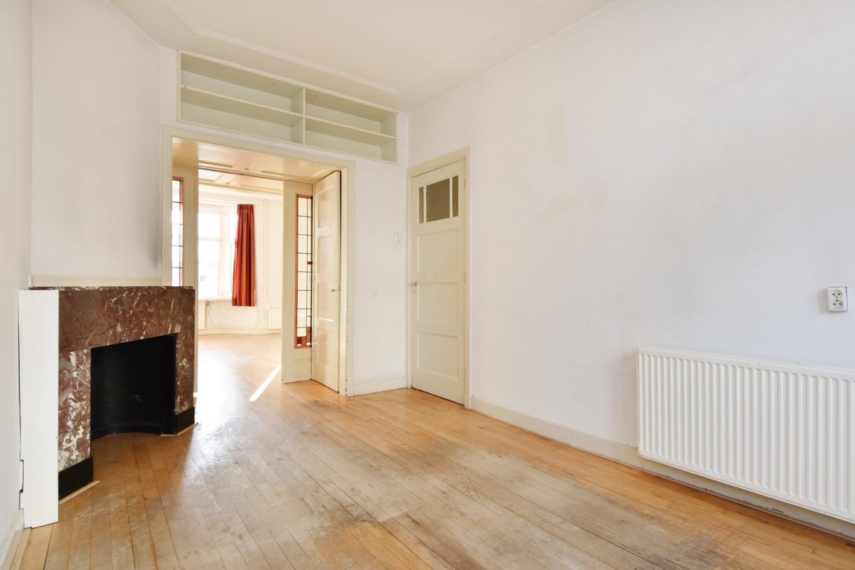 Nummer 178; entree begane grond, vestibule met meterkast met elektra- en watermeter, tochtdeur voor trapopgang met kast met gasmeter. Trap naar 1e etage, overloop met toilet, keuken ca. 3.30×1.77 met rvs aanrecht, fornuis met afzuigkap en terrasdeur, kamers en suite ca. 10.50×2.76 deels 4.78 met originele suiteseparatie met 4 vaste kasten en schuifdeuren met glas-in-lood, 2 marmeren schouwen, originele plafonds, erker aan de voorzijde en openslaande deuren aan de achterzijde naar ruim terras ca. 4.88×2.87 op de middagzon met balkonkast.