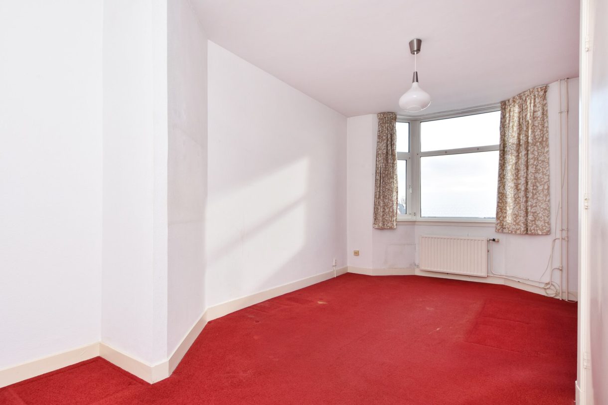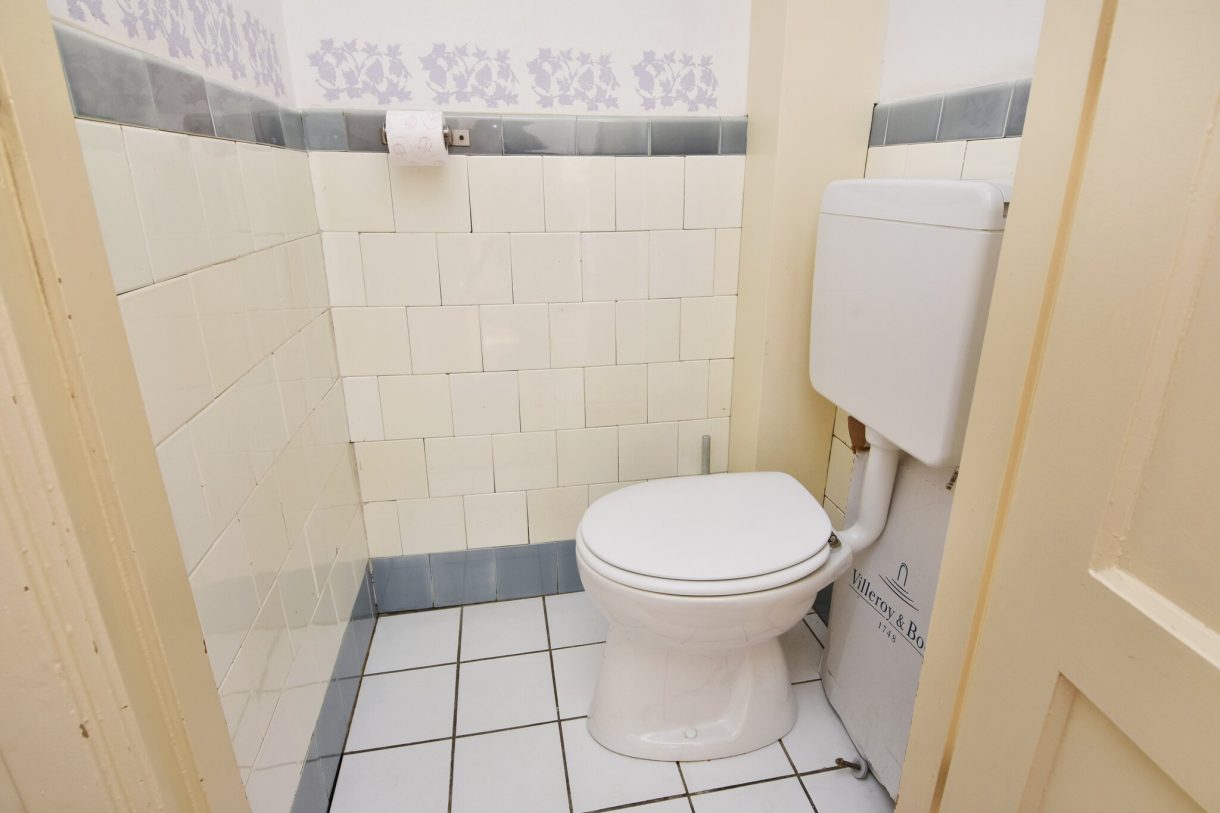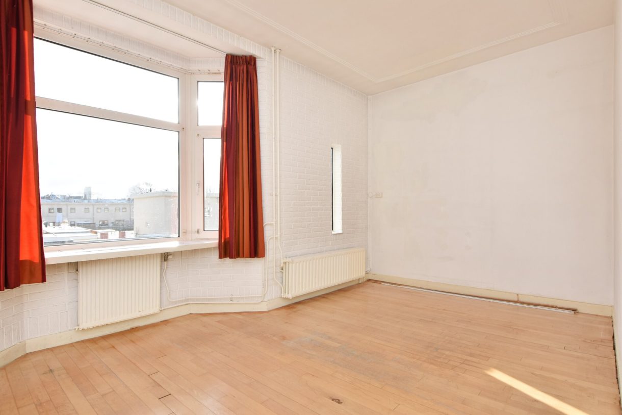 Trap naar 2e etage, overloop met toilet, badkamer ca. 3.37×1.87 met ligbad met douchewand, dubbele vaste wastafel en te openen bovenlicht ten behoeve van ventilatie, achterkamer ca. 4.43×2.78 met marmeren schouw en deur naar achterbalkon over de volle breedte, L-vormige voorkamer ca. 4.78/2.78×5.45 met erker.
