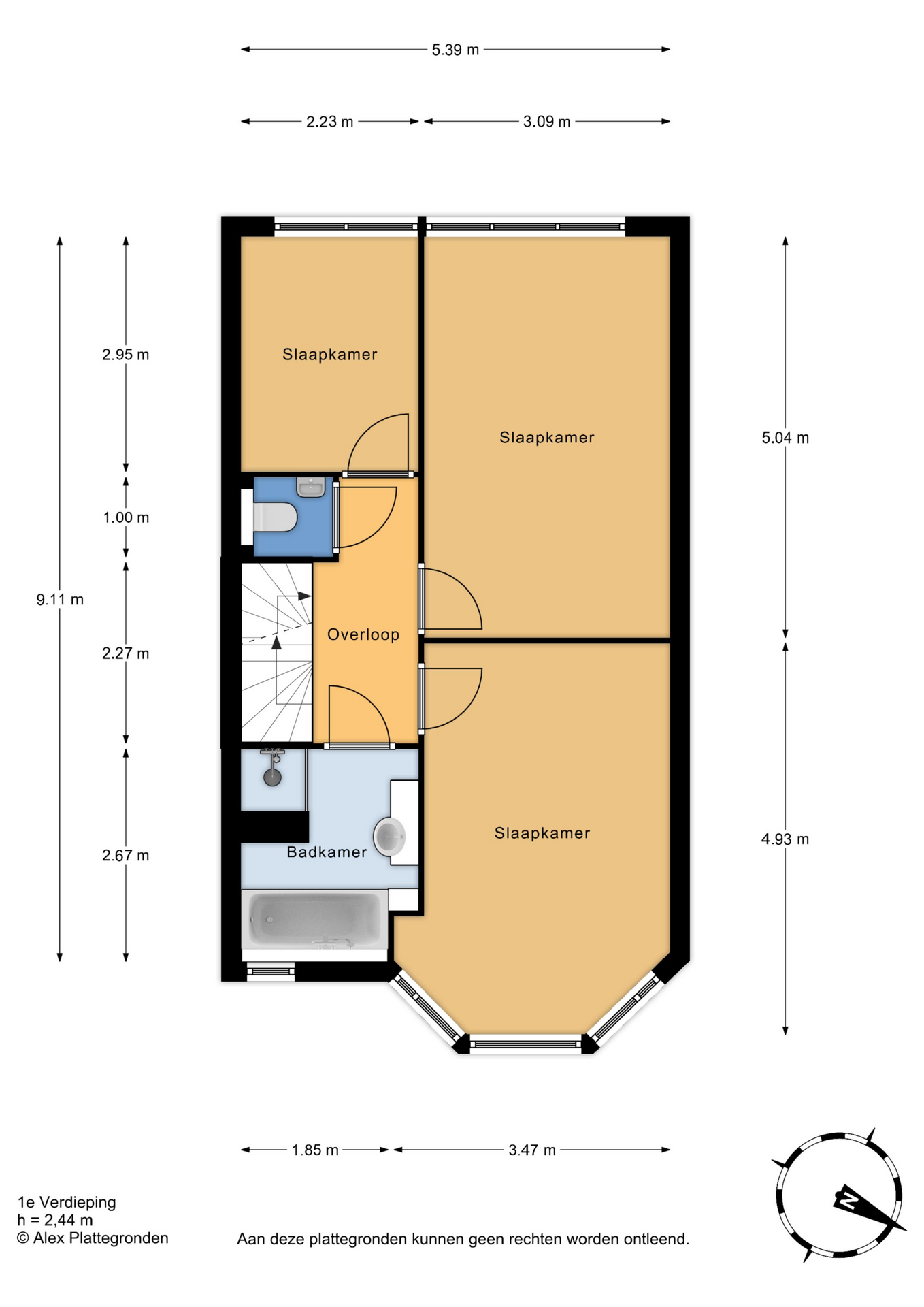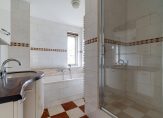 Op de 1e verdieping een overloop met separaat toilet, badkamer met ligbad, separate douche en wastafelmeubel. Deze verdieping heeft 3 slaapkamers 4.94×3.10, 5.05×3.10 en 2.96×2.23.