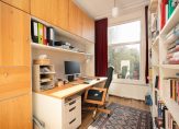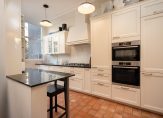De trap naar het tussengelegen bordes met toegang naar de voorkamer gaat dan weer 5 treden omhoog naar de overloop op de 1e etage, voorkamer met schouw en dubbele openslaande deuren naar inpandig voorbalkon, achterkamer met inloopkast, klassieke schouw en dubbele openslaande deuren naar achterterras, luxe ruime badkamer met bad op pootjes, wastafelmeubel en douche, apart toilet en een vaste kast.