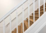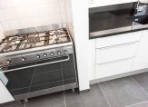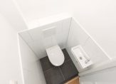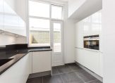 Trap naar de 1e verdieping, gang, luxe toilet met fonteintje, ruime woonkamer ca. 12.40×4.10 met aan de voorzijde een balkonnetje met uitzicht op “de Fred”, aan de achterzijde openslaande deuren naar het ruime terras van ca. 35 m², luxe en zeer ruime keuken ca. 4.12×2.21/3.21 met veel werkruimte en voorzien van alle apparatuur, voorzijkamer 2.26×2.21.