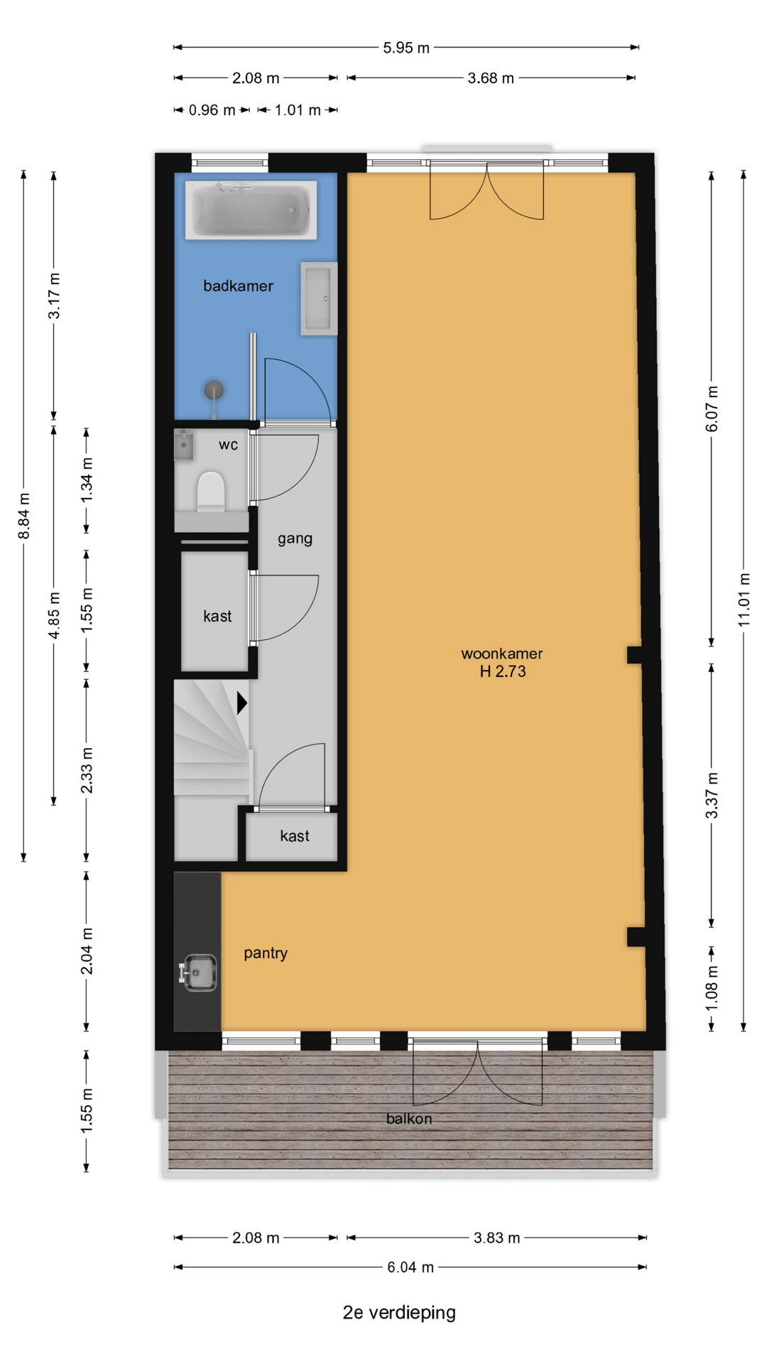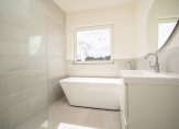 Vanuit de overloop de trap naar de 2e etage, gang met twee vaste kasten en apart toilet, tweede volwaardige badkamer voorzien van inloopdouche met glazen wand, vrijstaand ligbad en badkamermeubel met wastafel. Tot slot de riante tweede woonkamer met pantry, spectaculaire lichtinval en zonneterras met uitzicht aan de rechterzijde over de duinen van het Zwarte pad. Eventueel kan deze kamer door een koper worden opgedeeld in twee ruime slaapkamers.