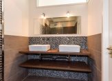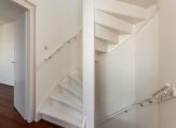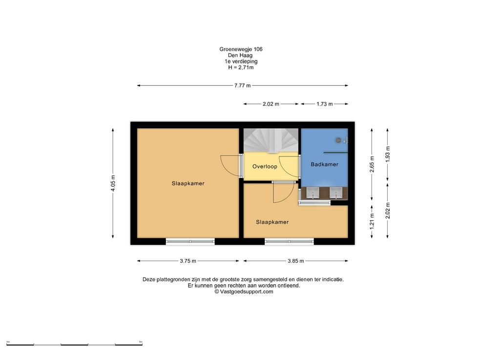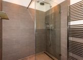Trap naar 1e etage, overloop, ruime slaapkamer 4.05×3.75, 2e slaapkamer 3.85×2.02/1.21, luxe badkamer met inloopdouche en dubbele wastafel.
