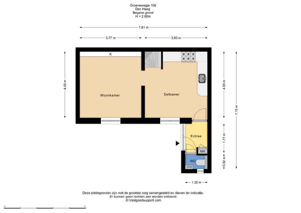 Vanaf de straat geeft een afgesloten poort toegang tot het hofje, entree woning via voortuin, hal, modern toilet met fonteintje, ruime eetkeuken 4.05×3.83 voorzien van alle apparatuur, doorloop naar zitkamer 4.05×3.77 voorzien van ingebouwde boekenkasten.
