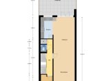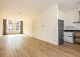 Entree op straatniveau, hal en trap naar 1e etage, overloop, toilet met fontein en ruime bergkast, zeer ruime doorgebroken woonkamer met luxe open keuken voorzien van alle apparatuur en openslaande deuren naar het terras op ZW gelegen. Tenslotte op deze verdieping nog een voorzijkamer.