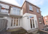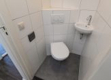 Entree op straatniveau met hal en trap naar de eerste verdieping, overloop, toilet met fontein, extra halletje met garderobekasten, ruime lichte L-vormige woonkamer met erker aan de voorzijde en aan de achterzijde openslaande deuren naar het ruime terras, ruime keuken voorzien van inbouw apparatuur.