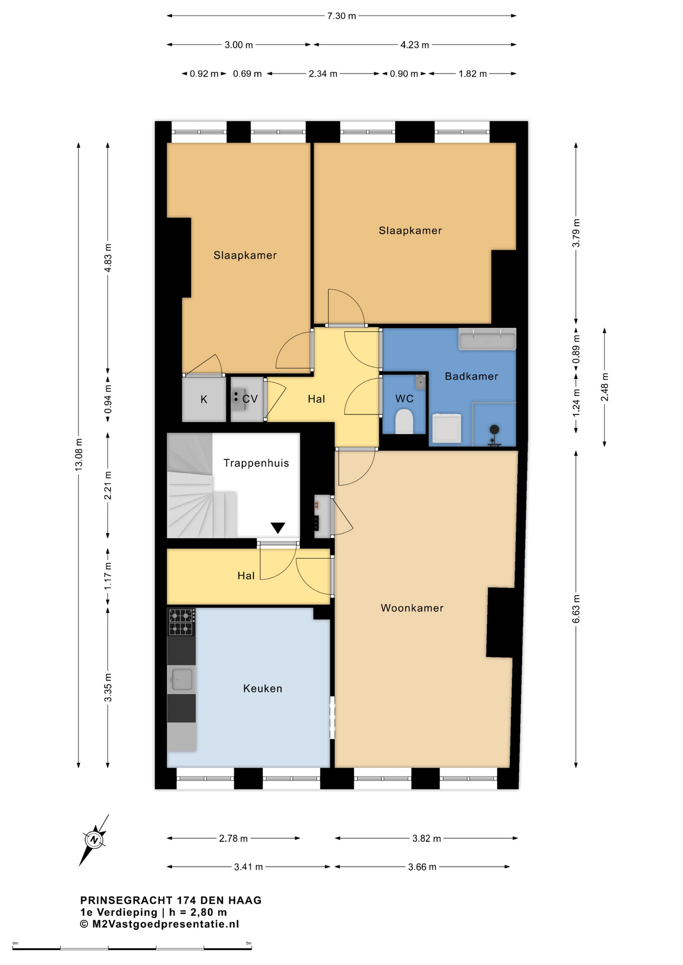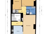 Centrale entree, trappenhuis naar 1e etage, entree appartement, ruime hal, aan de voorzijde een ruime woonkamer met doorgang naar naastgelegen ruime eetkeuken voorzien van nieuwe moderne keukeninrichting en inbouwapparatuur. Vanuit de woonkamer een 2e hal met apart toilet, 2 ruime slaapkamers, een luxe badkamer met inloopdouche, wastafelmeubel, handdoekradiator en wasmachine aansluiting.