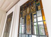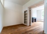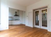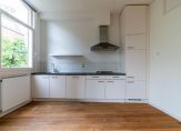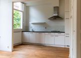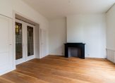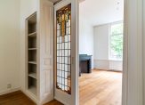 Centrale entree op de begane grond, ruimte voor de trap met meterkast, trap naar 1e etage welke geheel voorzien is van houten lamelvloeren met brede delen, entree appartement, kamers en suite met originele schuifseparatie met schuifdeuren met glas in lood en 4 vaste kasten, zwart marmeren schouw, thermostaat, intercom en erker met vrij uitzicht. Voorts open moderne keuken met natuurstenen aanrecht, rvs spoelbak, rvs kookplaat, rvs afzuigkap, vaatwasser, en koelkast met vriesvak.