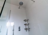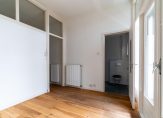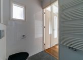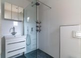 Fijne lichte achterkamer met openslaande deuren naar het zonnige balkon pal Zuid West met vrij uitzicht over het groene binnenterrein en toegang tot moderne badkamer met inloopdouche met regen–en handdouche, drain en glazen wand, meubel met vaste wastafel en spiegelkast, handdoekradiator, wandcloset, grote witte wandtegels, antraciet kleurige vloertegels, mechanische ventilatie en inbouwverlichting.