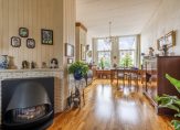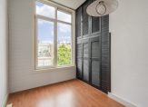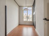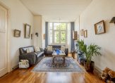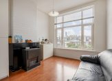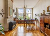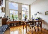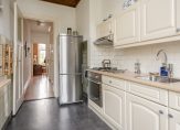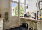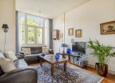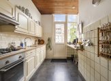 Eigen entree op straatniveau, hal met meterkast, trap naar de eerste etage, overloop voorzien van zijkamer aan de voorzijde, garderobekast en toilet. Vanuit de overloop de riante woonkamer voormalig en suite, veel privacy zonder directe buren aan de voorzijde, grote raampartijen, ca. 3 meter hoge plafonds en openslaande deuren naar achterbalkon over de volle breedte. De dichte keuken is aan de achterzijde gelegen en voorzien van deur naar balkon, 4-pitsgaskookplaat, bakoven en wasemkap.
