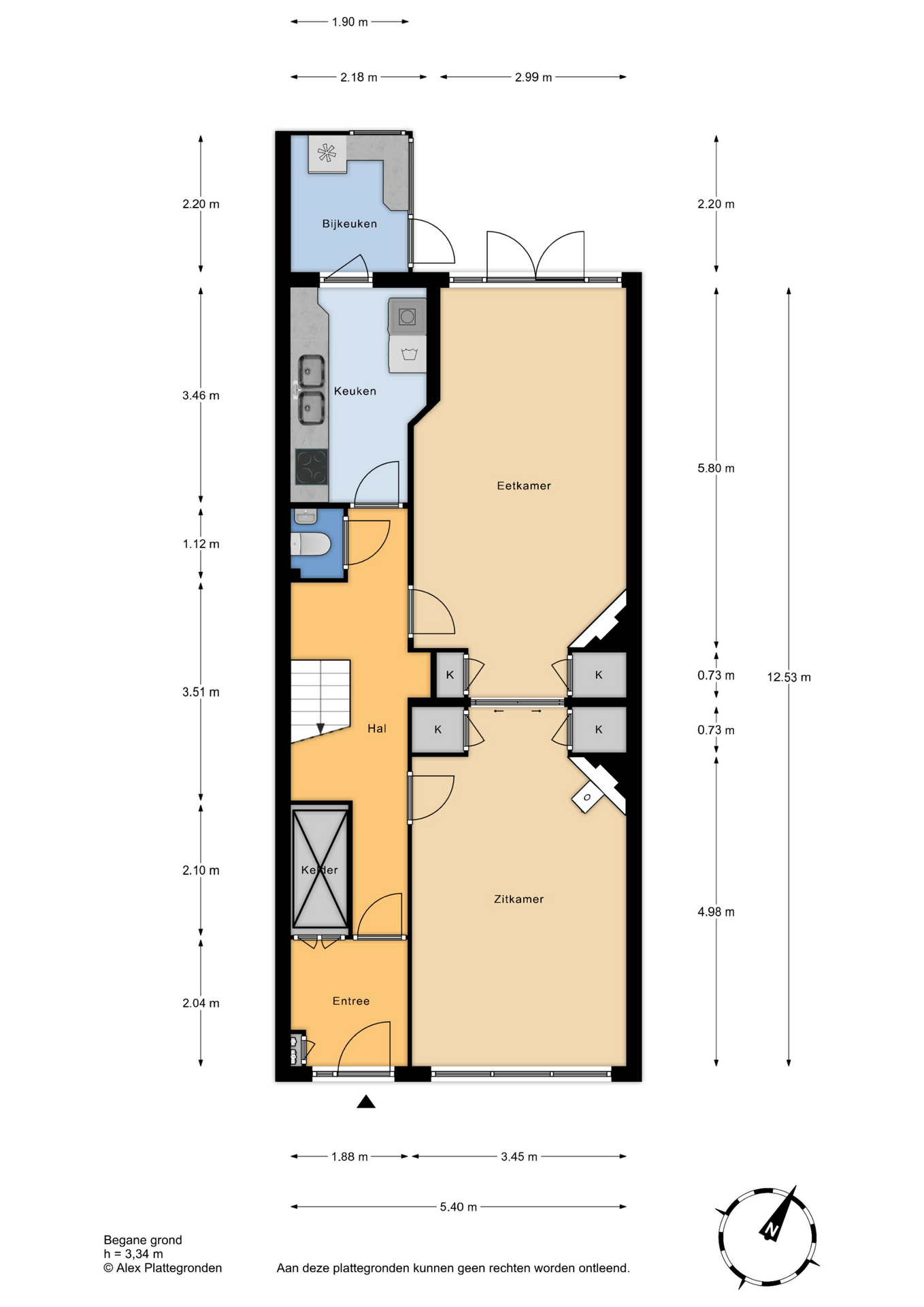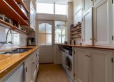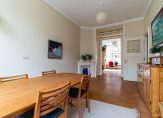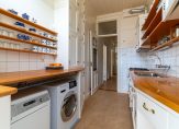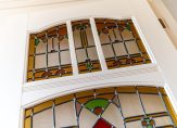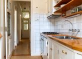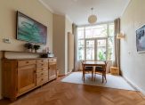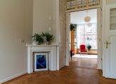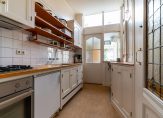 Entree met fraaie glas-in- ramen, vestibule met granito vloer en meterkast, deur naar ruime kelder van ca. 22 m², tochtdeur naar gang met toilet met fonteintje, sfeervolle en zeer lichte kamers en suite met visgraatparketvloer, separatie voorzien van schuifdeuren en glas-in-lood ramen, 4 vaste kasten en 2 schoorsteenmantels, openslaande deuren naar zonnige achtertuin op NW van ca. 35m². De keuken is voorzien van een handgemaakte keukeninrichting en voorzien van alle aansluitingen, doorgang naar de bijkeuken.