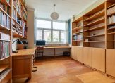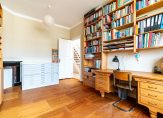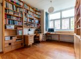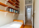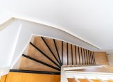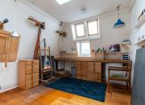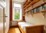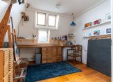Trap naar 2e etage, overloop, grote en zeer lichte kamer, thans in gebruik als atelier, met grote ingebouwde kast, voorzijkamer en luik naar dak.