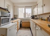 The open-plan kitchen is fitted with a simple kitchen unit. The generous living room enjoys large windows, an additional side window and direct access to the delightful, sun-filled rear terrace spanning the entire width of the apartment — a natural extension of the living space.