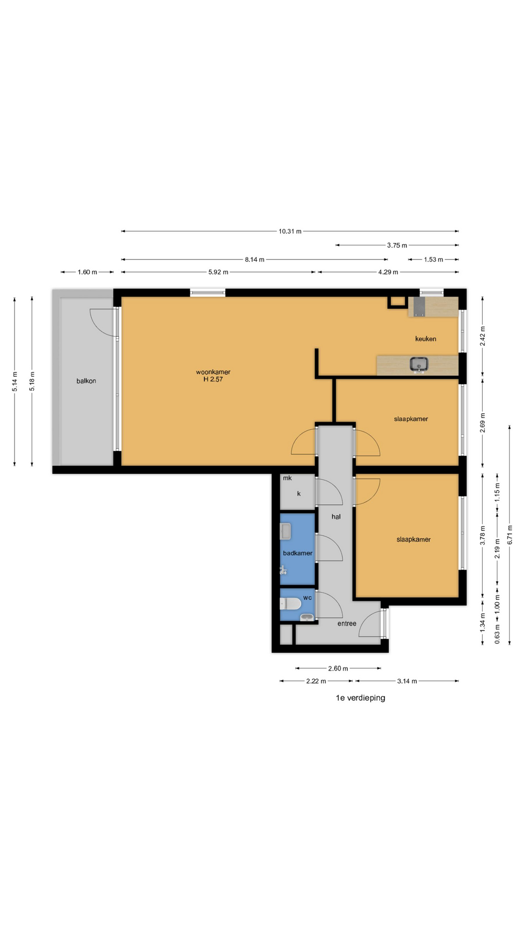 De 2e slaapkamer ca. 2.70m x 3.75m heeft een handige nis voor een kledingkast. De open keuken is voorzien van eenvoudig keukenblok.