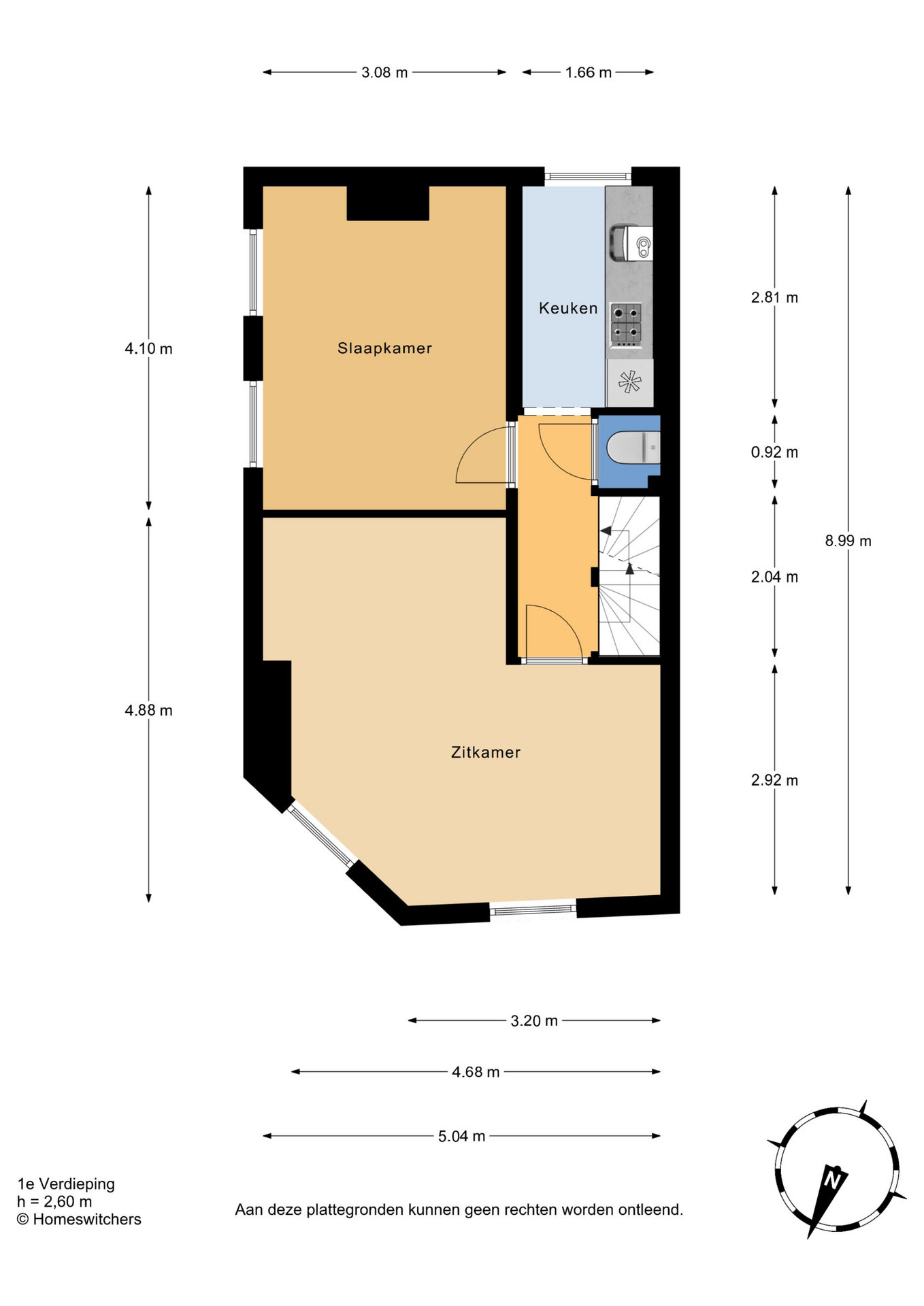 Eigen entree op straatniveau, trap naar de eerste etage, overloop. Toegang tot de L-vormige zitkamer aan de voorzijde, die dankzij de grote raampartijen geniet van veel lichtinval. Slaapkamer aan de achterzijde, evenals de tussenliggende keuken. Toilet in de hal. Trap naar de tweede etage met een ruime overloop, die toegang biedt tot de badkamer en de tweede, achtergelegen slaapkamer. Aansluiting voor de wasmachine op de overloop.