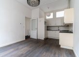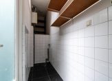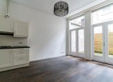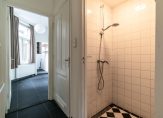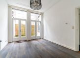 Eigen entree met vestibule, ruime slaapkamer aan de voorzijde met hoog ornamenten plafond, gang met trapkast, apart toilet, badkamer met inloopdouche en wastafel, slaapkamer aan de achterzijde en berging met cv-ketel en opstelplaats voor wasmachine. Aan de achterzijde de woonkamer eveneens met ca. 3,17 m hoge ornamenten plafonds, dubbele openslaande deuren naar achtertuin en moderne open keuken voorzien van 4-pits gaskookplaat, koel-/vriescombinatie, afzuigkap en vaatwasser.