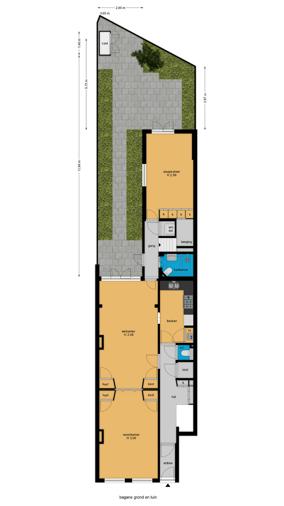 De ruime lichte kamer en suite is voorzien van een separatie met schuifdeuren en vaste kasten plafonds met lijstwerk, glas-in-lood bovenlichten, lamelparketvloer en openslaande deuren naar de heerlijk zonnige L-vormige tuin gelegen op ZW. De ruime moderne keuken met inbouwapparatuur is zowel bereikbaar vanuit de gang als vanuit de woonkamer.