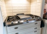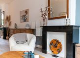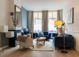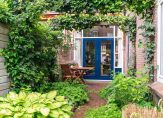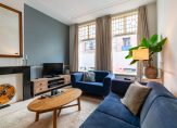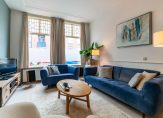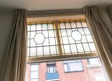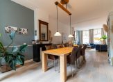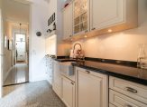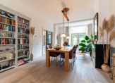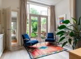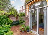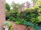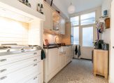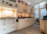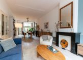 De ruime lichte doorgebroken kamer en suite is voorzien van plafonds met lijstwerk, 2 marmeren schoorsteenmantels, glas-in-lood bovenlichten, brede houten vloerdelen en openslaande deuren naar de heerlijk zonnige L-vormige tuin gelegen op ZW. De keuken met inbouwapparatuur is zowel bereikbaar vanuit de gang als vanuit de woonkamer en heeft eveneens een terrazzo vloer, deur naar ruime bijkeuken met opstelplaats CV-ketel, wasmachine en wasdroger.