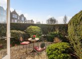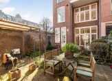 Riante voortuin waardoor het pand ver van de weg is gelegen, entree vanuit de Frankenslag met enorme hal die wordt gebruikt als ontvangstruimte en beschikt over een schitterende lichtinval, fraaie glas in lood bovenlichten, grote marmeren vloertegels, pantry, apart toilet met klapraam, wachtkamer en deur naar keurig aangelegde achtertuin van ca. 71 m² die beschikt over een zijingang en gunstig is gelegen op de ochtendzon.