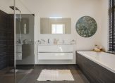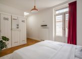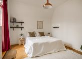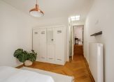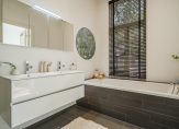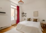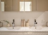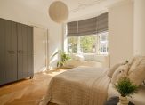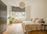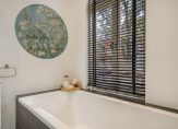 Aan de voorzijde de eerste riante slaapkamer met ornamenten plafond en erker met zitje. De slaapkamer heeft een eigen badkamer voorzien van hoogwaardig tegelwerk, ligbad, natuurlijke daglichttoetreding, meubel met dubbele wastafel en inloopdouche.
