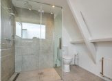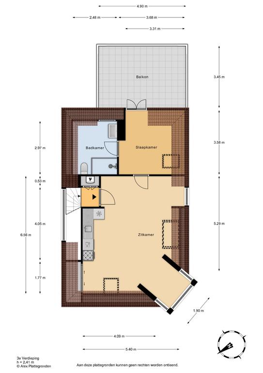 Entree begane grond, gemeenschappelijke hal, trap naar 3e etage, entree appartement, ruime sfeervolle en zeer lichte wooneetkamer ca. 6.56×5.40 met houten vloer en open keuken met inbouwapparatuur, ruime slaapkamer ca. 3.58×3.31 met toegang naar de luxe badkamer voorzien van inloopdouche, wastafelmeubel en toilet. Vanuit de slaapkamer openslaande deuren naar het ruime zonnige terras ca. 4.90×3.45.