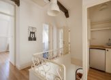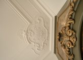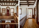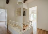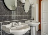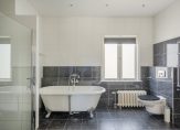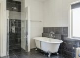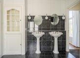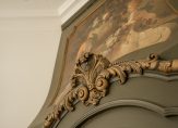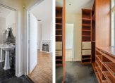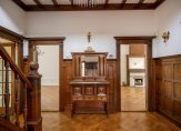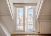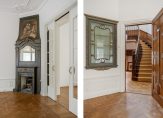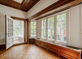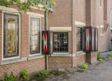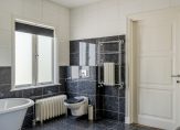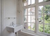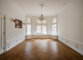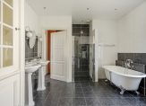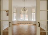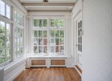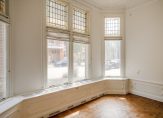 Op de 1e etage een prachtige ruime overloop met lambrisering, fraai origineel balkenplafond en glas-in-lood ramen, aan de achterzijde een ruime slaapkamer met geornamenteerd plafond, fraaie schoorsteenmantel, radiatoromkastingen en parketvloer, aansluitend een ruime walk-in-closet , toegang naar de riante badkamer die volledig is uitgerust met badkamergarnituur inclusief een vrijstaand bad op pootjes, separate douche, 2 wastafels op zuil, wandcloset, klassiek type kranen, Rvs-handdoekradiator, ingebouwde kast, inbouwspots, zwart gemarmerde vloer- en wandtegels alsmede wit gemarmerde wandtegels en vloerverwarming. De badkamer is eveneens vanaf de overloop te bereiken. De voorkamer fraai gedecoreerd met lambriseringen, radiatoromkastingen, een eker en parketvloer, grote inbouwkast. In 2016 is het glas vervangen voor Van Ruysdael isolatieglas. Het voormalige balkon is omgebouwd tot een serre met ramen voorzien van glasroeden.