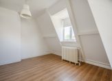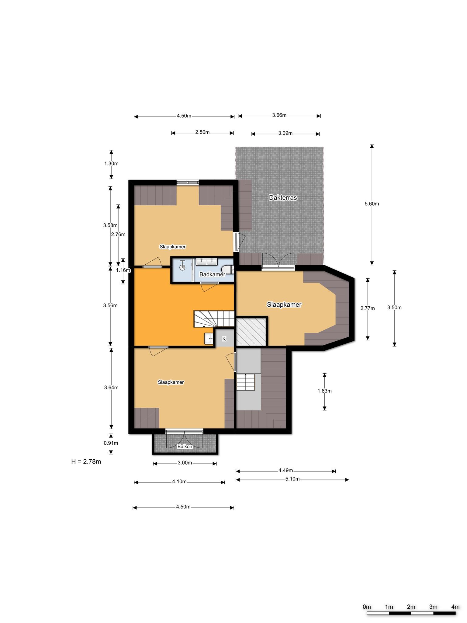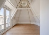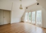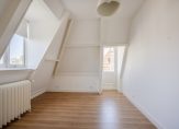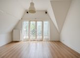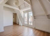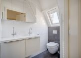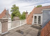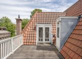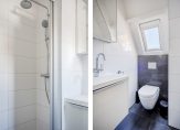 Trap naar 2e etage, overloop met fraaie balkconstructie, pantry voorzien van werkblad met gootsteen en koelkast, badkamer met douche, wastafelmeubel, wandcloset, handdoekradiator en Velux dakraam, ruime voorkamer, openslaande deuren naar klein voorbalkon, deur naar zolderruimte, 2e ruime slaapkamer met openslaande deuren naar groot zonnig dakterras 5.60×3.09, 3e ruime slaapkamer met dakkapel en deur naar eerder genoemd terras. De kamers en overloop op deze verdieping zijn voorzien van kwalitatieve laminaatvloeren.
