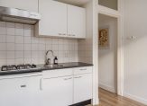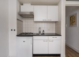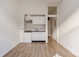 Entree van het gebouw, trap naar de eerste etage, entree appartement, heerlijk lichte woonkamer met keurige laminaatvloer en open keuken voorzien van eenvoudig keukenblok, gaskookplaat en losse koelkast. Aan de achterzijde is een ruime hal en tevens de slaapkamer. Tenslotte een moderne badruimte met douche, wastafel en toilet.