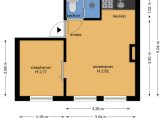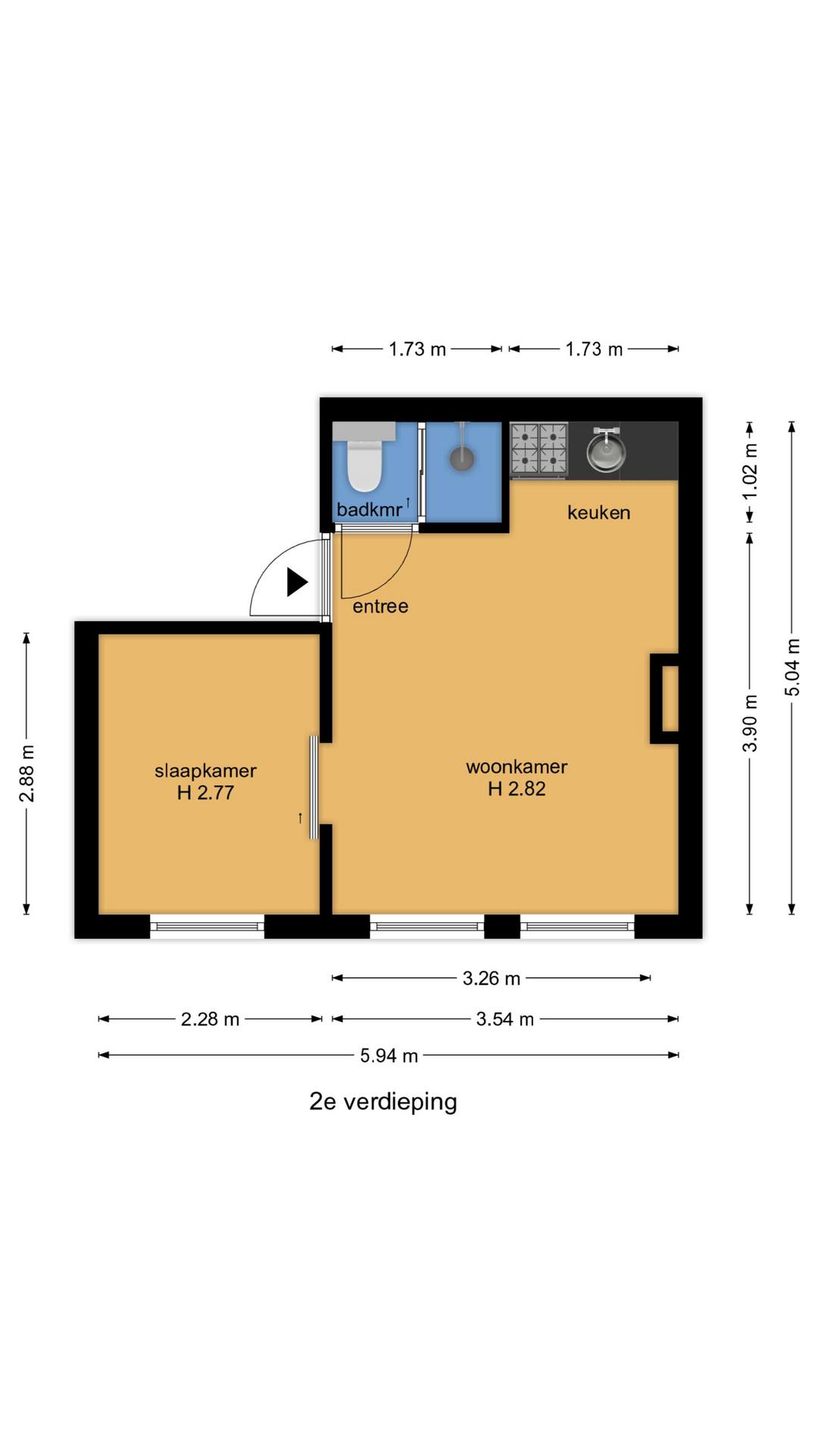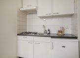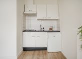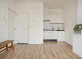 Entree van het gebouw, trap naar de tweede etage, entree appartement, woonkamer met keurige laminaatvloer en open keuken voorzien van eenvoudig keukenblok, gaskookplaat en losse koelkast. De lichtinval is uitstekend vanwege de grote raampartijen. De slaapkamer is eveneens aan de voorzijde gelegen en beschikt over een groot raam. Tenslotte een moderne badruimte met douche en toilet.