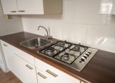 Een open keuken voorzien van inbouwapparatuur; gaskookplaat, koelkast met vriesvak, vaatwasser, afzuigkap, wasmachine en een vaste kast voor de CV-ketel.