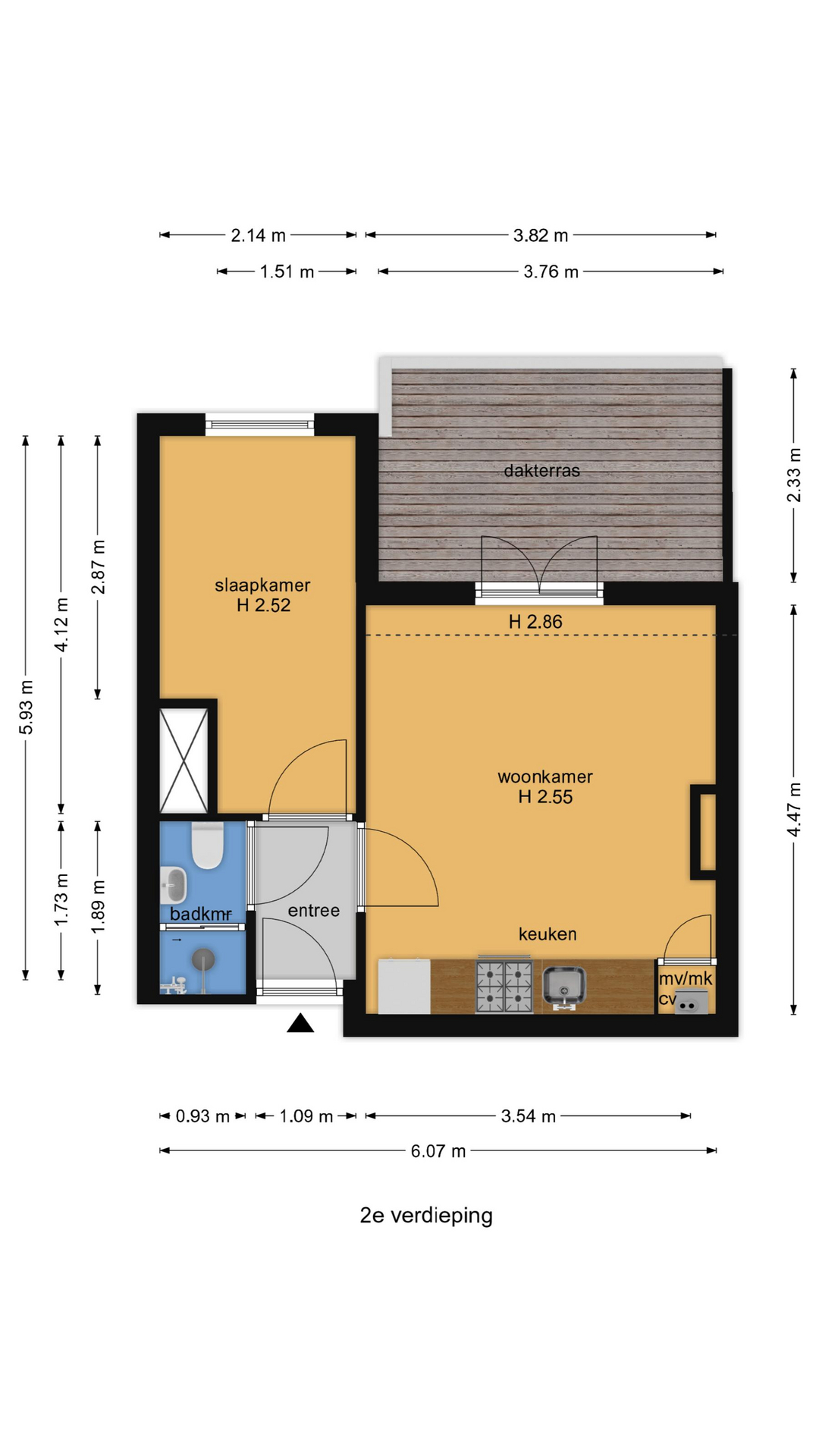Neutrale laminaatvloer welke door het gehele appartement ligt met uitzondering van de badkamer. Badkamer met douche, wastafel, spiegel en wandcloset. Aan de achterzijde van dit appartement ligt de slaapkamer ca. 4.12m x 2.14m met genoeg ruimte voor een tweepersoons bed en een kledingkast.