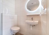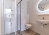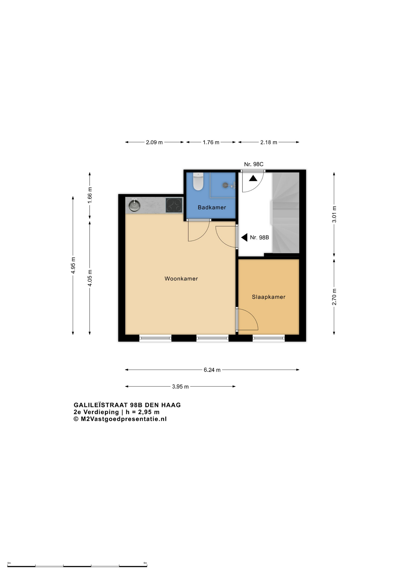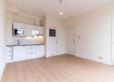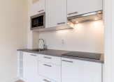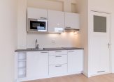 Gezamenlijke entree van het gebouw, trap naar de tweede etage, entree appartement, woonkamer met gunstige lichtinval vanwege de grote raampartijen en de plafondhoogte van ca. 2,95 meter, nieuwe open in keuken voorzien van kunststof werkblad, combimagnetron, inductiekookplaat en koelkast met vriesvak. De slaapkamer beschikt eveneens over een hoog plafond en heeft leuk uitzicht over de Galileïstraat. De tussengelegen badkamer beschikt over fraai tegelwerk, toilet, inloopdouche, wastafel met planchet en ronde spiegel met verlichting.