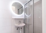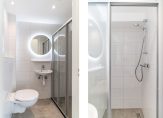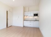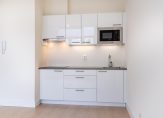 Gezamenlijke entree van het gebouw, trap naar de tweede etage, entree appartement, woonkamer met gunstige lichtinval vanwege de grote raampartijen en de plafondhoogte van ca. 2,95 meter, nieuwe open in keuken voorzien van kunststof werkblad, combimagnetron, inductiekookplaat en koelkast met vriesvak. Vanuit de woonkamer openslaande deuren naar ruim terras van ca. 8 m² dat pal zuidoost is gelegen. De slaapkamer is ruim van formaat, beschikt eveneens over een hoog plafond en heeft leuk uitzicht over de binnentuinen aan de achterzijde. De tussengelegen badkamer beschikt over fraai tegelwerk, toilet, inloopdouche, wastafel met planchet en ronde spiegel met verlichting.