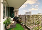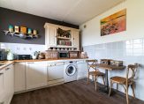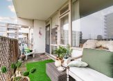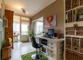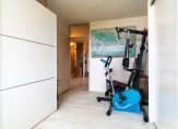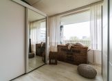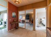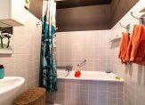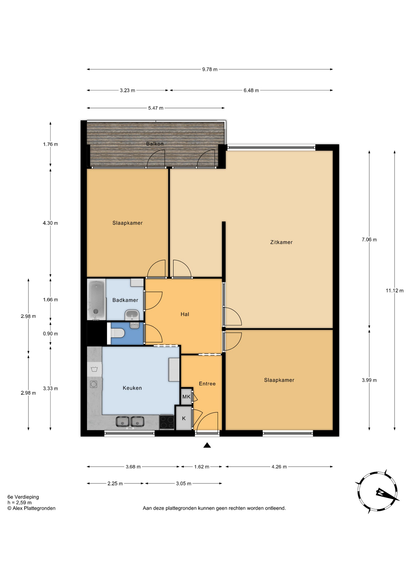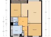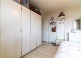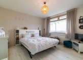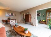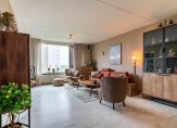 Entree van het complex, trap of lift naar de 6e etage, galerij met entree naar het appartement, vestibule met meterkast en hal voorzien van apart toilet met fonteintje. Aan de achterzijde de riante woonkamer met bijgetrokken zijkamer en deur naar zonnig achterbalkon op het zuidwesten. Riante slaapkamer aan de voorzijde, tweede ruime slaapkamer aan de achterzijde met deur naar achterbalkon van ca. 9 m² en tussengelegen badkamer met ligbad en wastafel. Aan de voorzijde de moderne keuken eveneens goed van formaat en voorzien van houten aanrechtblad, dubbele spoelbak en gaskookplaat. Het appartement beschikt over een eigen berging van 9 m² in de onderbouw.