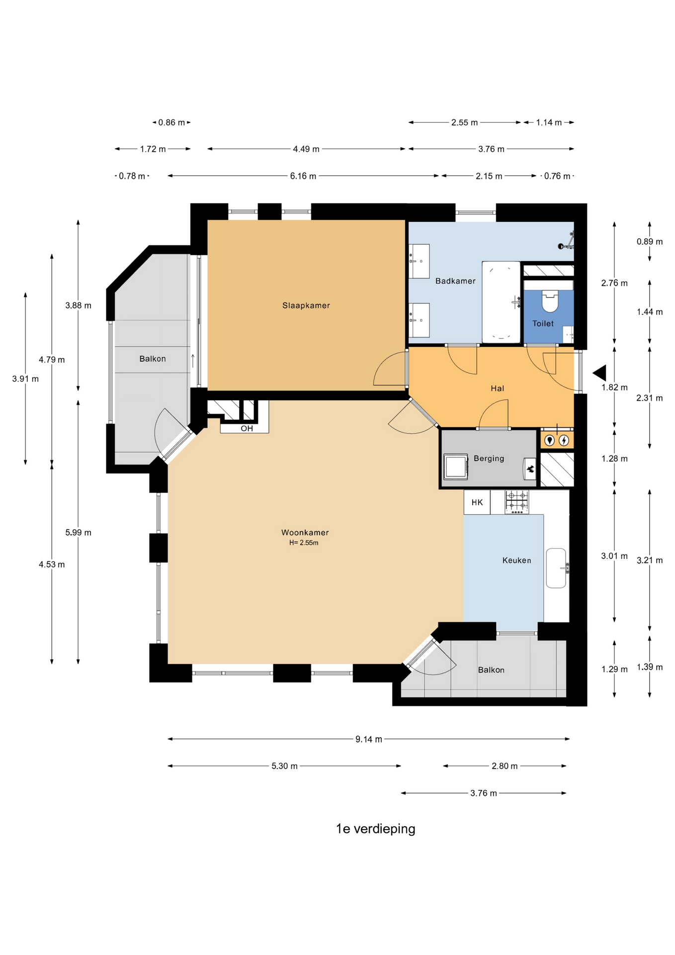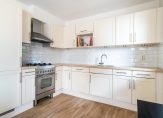 Entree van het appartementengebouw met de lift naar de eerste etage, entree van het appartement, hal met technische ruimte en meterkast. Vanuit de hal de woonkamer aan de voorzijde die zeer vrij is gelegen en beschikt over een mooie breedte van ca. 6 meter. Het uitzicht aan de voorzijde is erg fraai over de brede Johan van Oldenbarneveltlaan en karakteristieke herenhuizen van het Statenkwartier. De open keuken in hoekopstelling is voorzien van deur naar zijbalkon, hardstenen werkblad, rvs gasfornuis met oven, koel-/vriescombinatie, inbouwspots en vaatwasser.