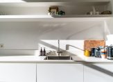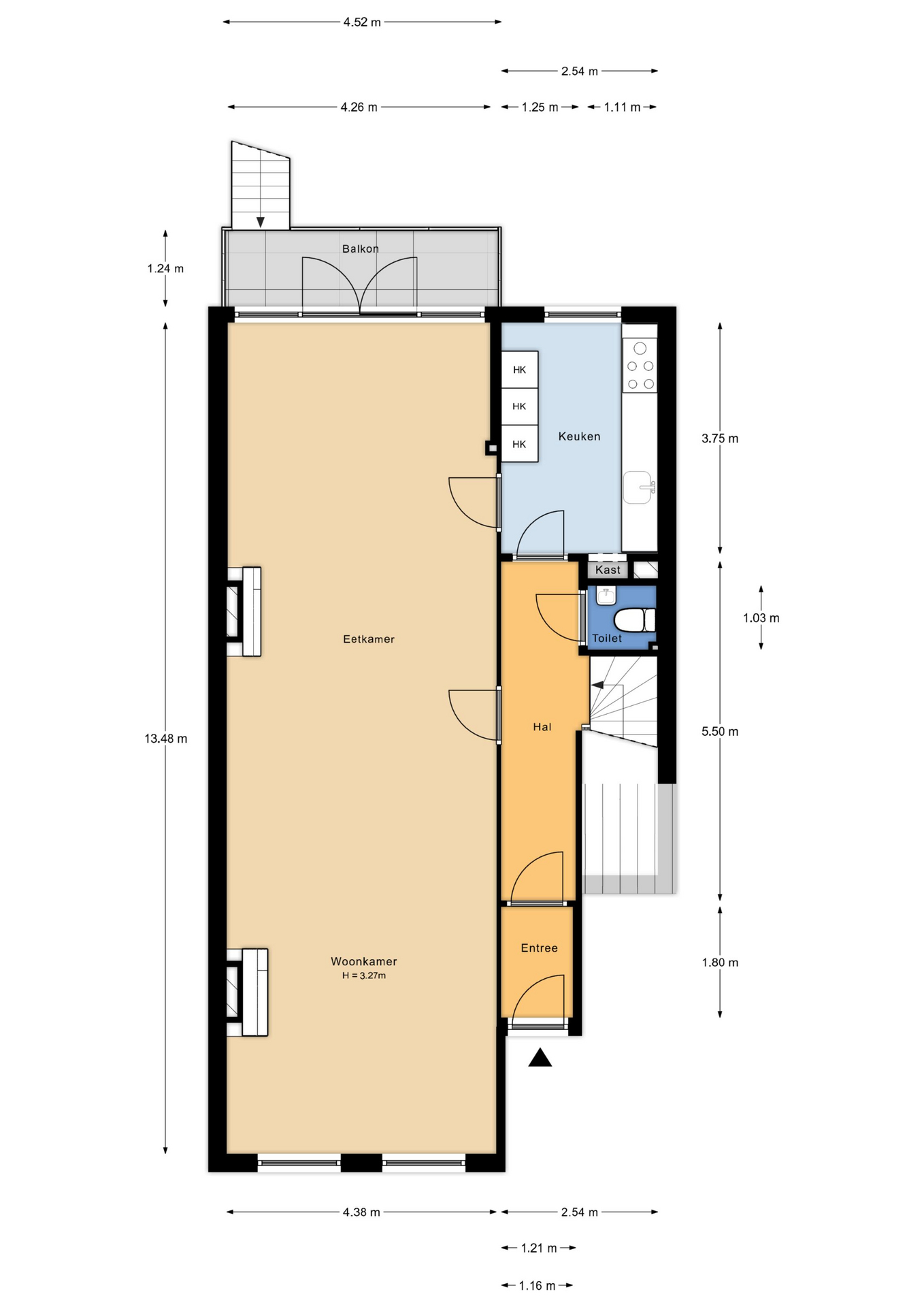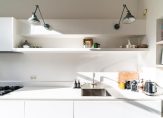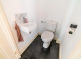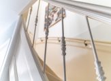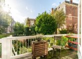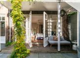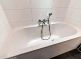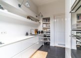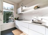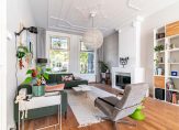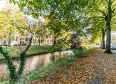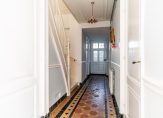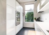 Trap naar de bel-etage, entree appartement, hal voorzien van apart toilet. Vanuit de hal de karakteristieke woonkamer voormalig en suite met hoge ornamenten plafonds, glas in lood bovenlichten, parketvloer, open haard en veel privacy dankzij vrije ligging aan de achterzijde. De moderne keuken is voorzien van een composiet werkblad, 5-pits gaskookplaat, afzuigkap, vaatwasser, koelkast, vriezer, combimagnetron en hoog model oven. Vrij kenmerkend voor deze bouw is het balkon aan de bel-etage waarbij de huidige eigenaren een vaste trap naar de achtertuin hebben laten plaatsen.