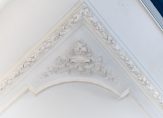 Entree, trap naar de eerste etage, overloop met toilet en douche, zijkamer aan de voorzijde, schitterende kamers en suite met originele ornamenten plafonds van ca. 3,12 meter hoog, serre aan de achterzijde, keuken aan de achterzijde met eenvoudig keukenblok.