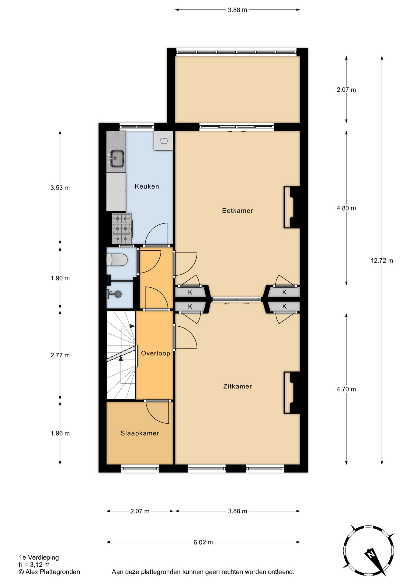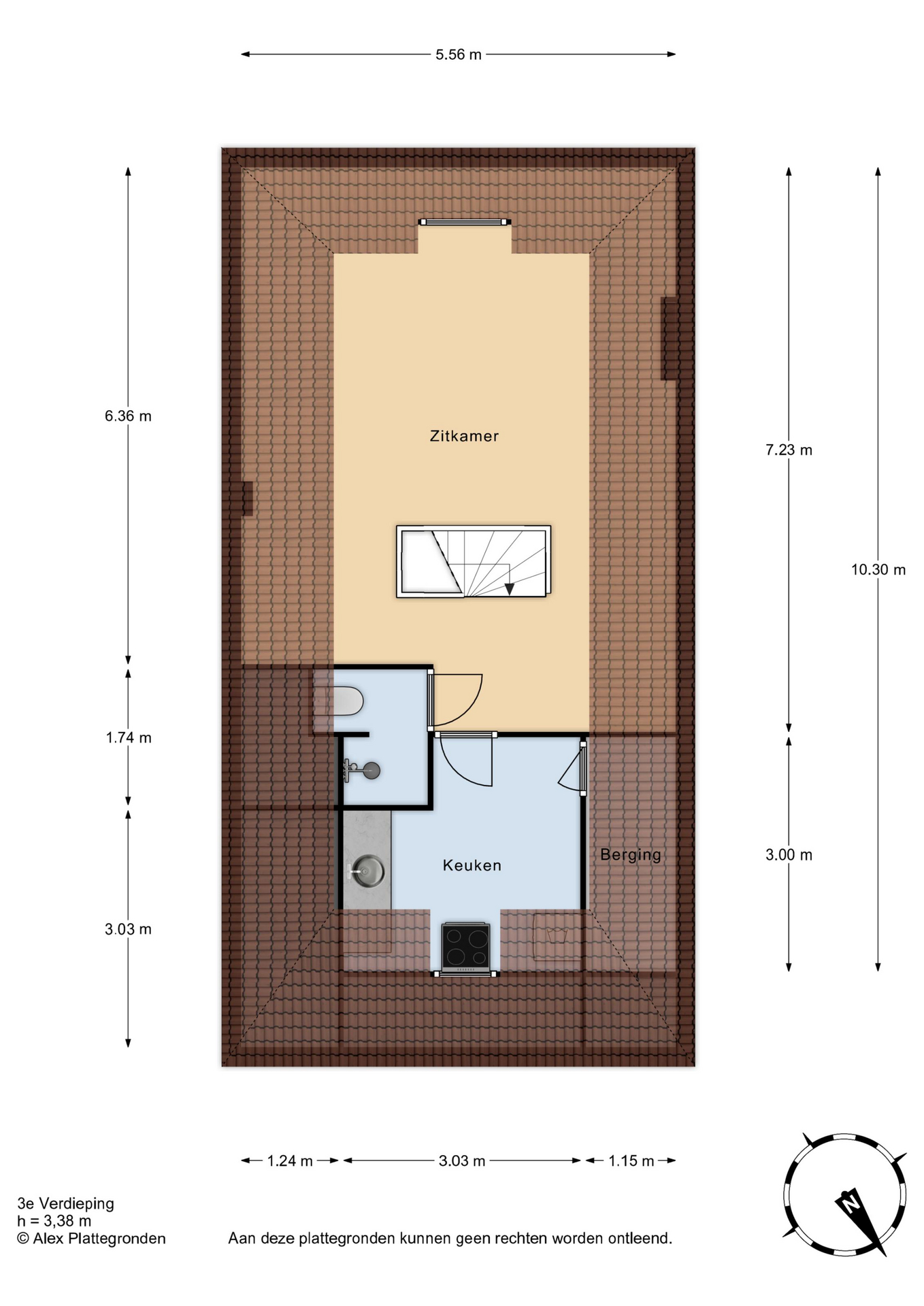 De derde etage betreft een kapetage met kamer over de volle breedte, keuken aan de achterzijde met eenvoudig keukenblok en badkamer voorzien van toilet en douche.