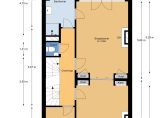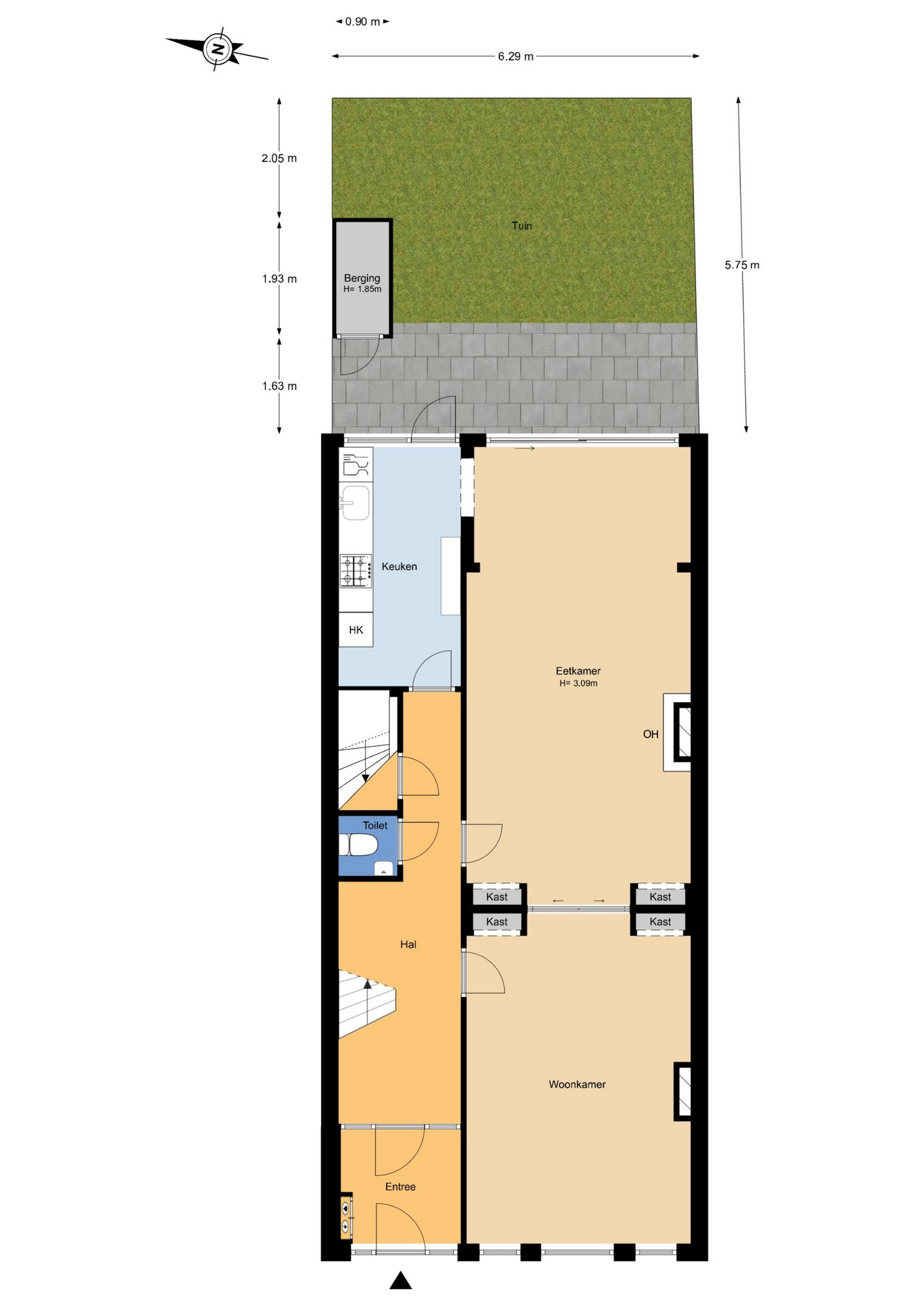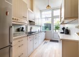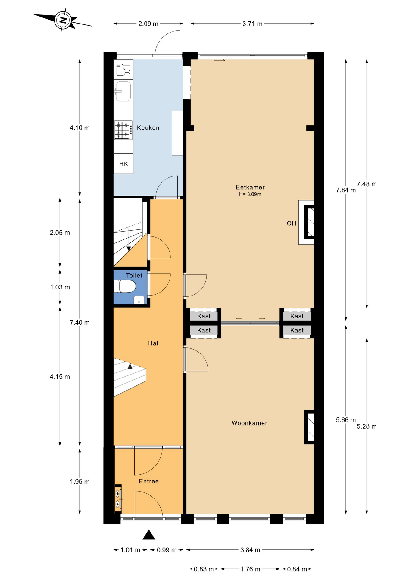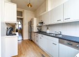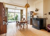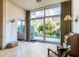 Riante hal met vestibule, tochtdeur naar gang met toilet en trap naar de kelder. Vanuit de hal de kamers en suite met ca. 3,09 meter hoge ornamenten plafonds, suite separatie voorzien van schuifdeuren met glasroedeverdeling, vaste kasten en schuifpui naar achtertuin. De half open keuken voorzien van kunststof werkblad voorzien van 4-pits rvs gaskookplaat, inbouwoven en vaatwasser.