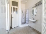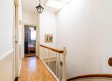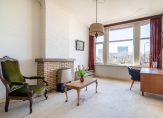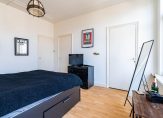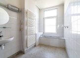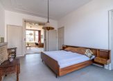 Vanuit de hal de trap naar de eerste etage, overloop met toilet, zijkamer aan de voorzijde, slaapkamer met hoge ornamenten plafonds en fantastisch vrij uitzicht over de Kranenburgweg. Vrij uitzonderlijk is dat de suite separatie ook op deze etage nog intact is. Aan de achterzijde nog een ruime slaapkamer en badkamer voorzien van granieten vloer, handdoekenradiator en wastafel.