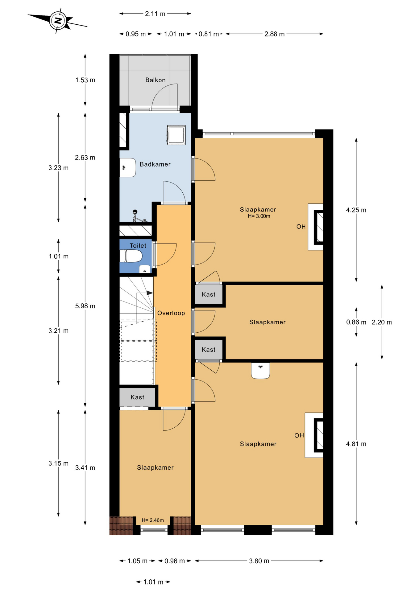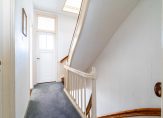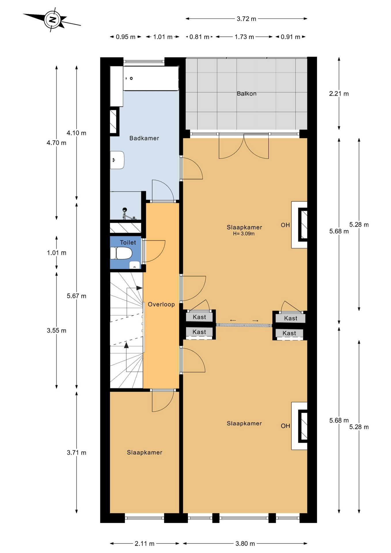 Vanuit de overloop de trap naar de tweede etage, overloopt met gunstige lichtinval dankzij groot daklicht. Zijkamer aan de voorzijde met vaste kast, slaapkamer een de voorzijde met vrij uitzicht en gunstige lichtinval, tussenkamer in gebruik als keuken, slaapkamer aan de achterzijde en badkamer met inloopdouche, wastafel en achterbalkon.