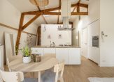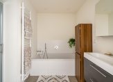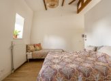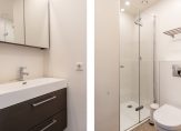 De eerste badkamer beschikt over een ligbad, aparte douche en wastafelmeubel, daarnaast is er een apart toilet. De slaapkamer staat in open verbinding met de woonruimte maar is eenvoudig te separeren.