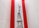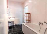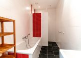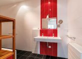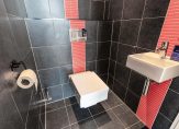 Voorts vanuit de gang toegang tot de beide slaapkamers eveneens gelegen aan de achterzijde met vrij uitzicht over het groen, ruime moderne badkamer met ligbad, grote inloopdouche, dubbele vaste wastafel met spiegel, inbouwverlichting, antraciet kleurige plavuizen vloer, en witte wandtegels afgewisseld met rode accenten, modern toilet met wandcloset, fontein, wand- en vloertegels alsmede inbouwverlichting.