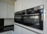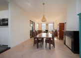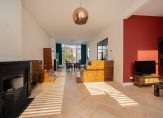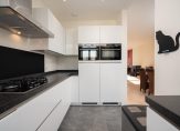 Gezamenlijke entree op de begane grond, trap naar de eerste etage, entree appartement, trap naar de tweede etage, hal voorzien van modern toilet en dubbele stalen deuren naar de doorgebroken woonkamer met fraaie parketvloer, openslaande deuren naar het terras en luxe open keuken voorzien van hoogwaardig werkblad, AEG 5-pits gaskookplaat, twee combiovens, vaatwasser, inbouwkoelkast en vriezer.