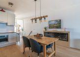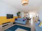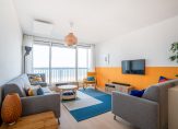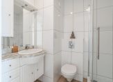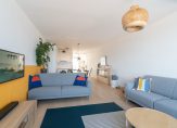 Trap naar hoger gelegen etage, ruime lichte woonkamer met schuifpui naar balkon met vol zeezicht, ruime moderne keuken met inbouwapparatuur. Aan de achterzijde een 2e ruime slaapkamer eveneens met schuifpui naar groot balkon gelegen op ZO met uitzicht over de stad, tenslotte een 2e ruime badkamer voorzien van douche, toilet en wastafelmeubel.
