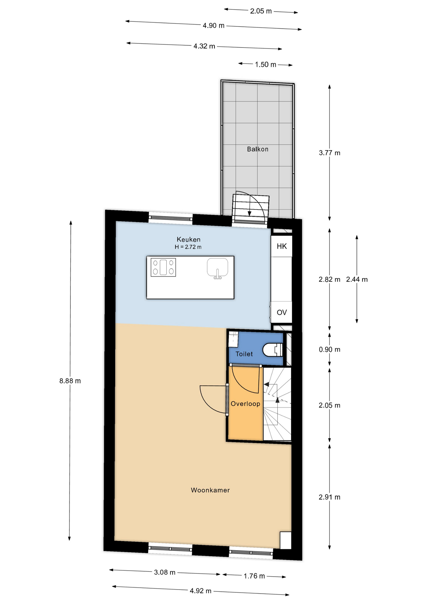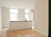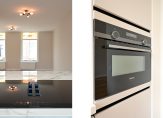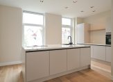 Eigen entree op straatniveau, meterkast met uitgebreide elektrische installatie, trap naar de eerste etage, overloop met ruim toilet, deur met glasroedeverdeling naar doorgebroken woonkamer met fantastische lichtinval en glas in lood bovenlichten, luxe open keuken aan de achterzijde voorzien van kookeiland, composiet werkbladen en hoogwaardige Siemens inbouwapparatuur. Aan de achterzijde een deur naar het terras dat op het zonnige zuidwesten is gelegen.